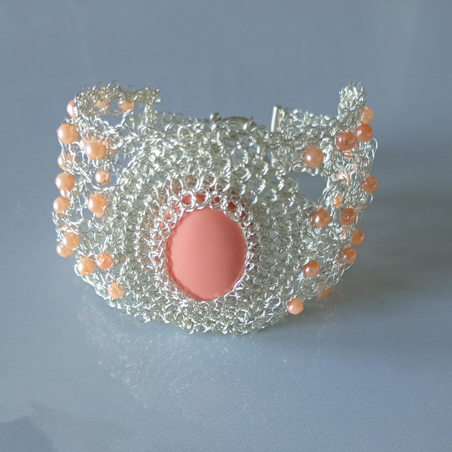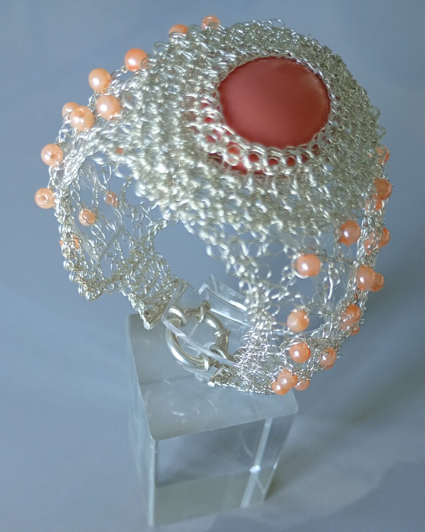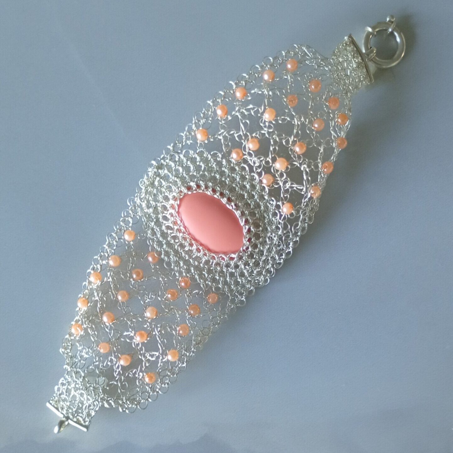Bracciale a maglia di merletto in argento 925 con pietra di corniola naturale e perline rosa con chiusura a molla, lo stile esclusivo di questo gioiello realizzato da sapienti mani artigianali. Il gioiello è splendido va indossato con disinvoltura aggiungendo eleganza alla tua personalità. Lunghezza 19 cm altezza 5,5 cm variabile.