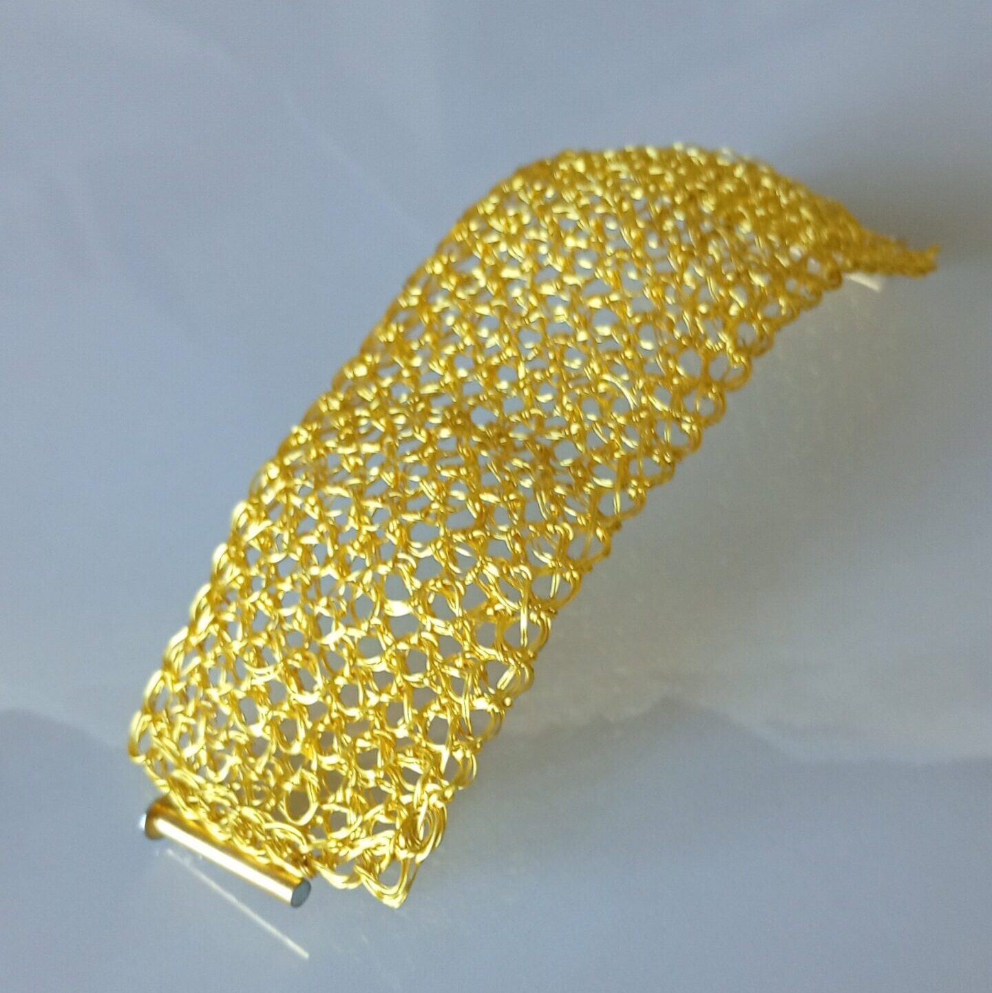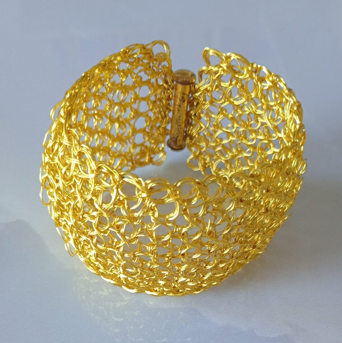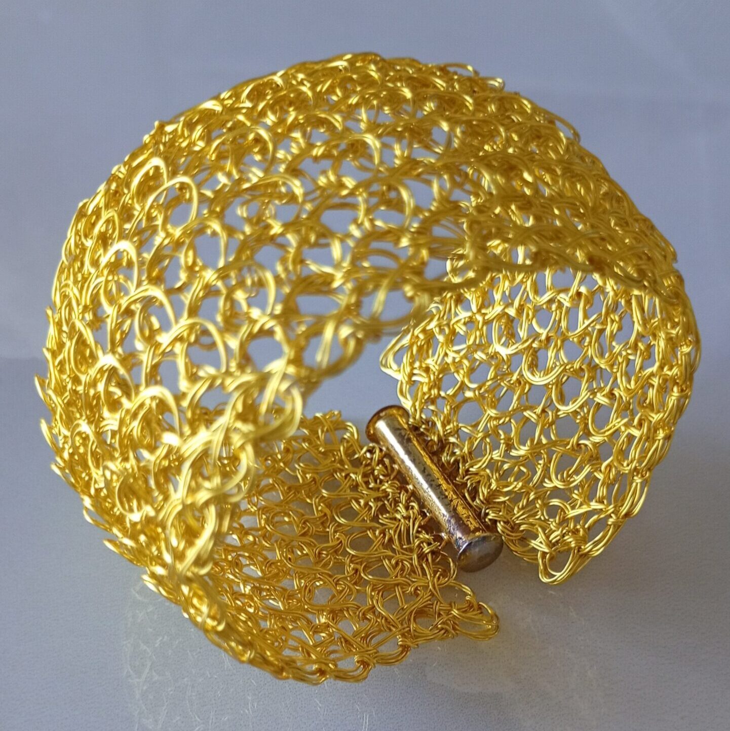 Bracciale in rame placcato in oro di forma cilindrica a maglia larga con chiusura a scomparsa, dallo stile originale ed esclusivo, realizzato da sapienti mani artigianali. Il gioiello è splendido va indossato con disinvoltura aggiungendo eleganza alla tua personalità . Lunghezza 18 cm altezza 5 cm – abbinabile con orecchini R0013 e anello A0014.