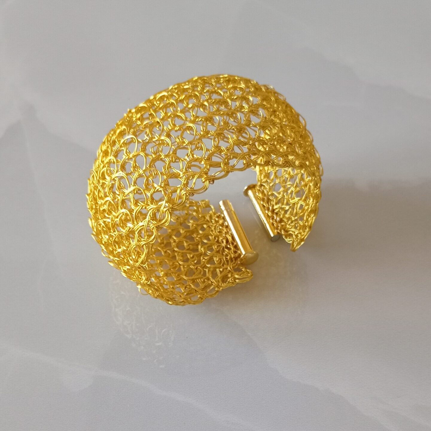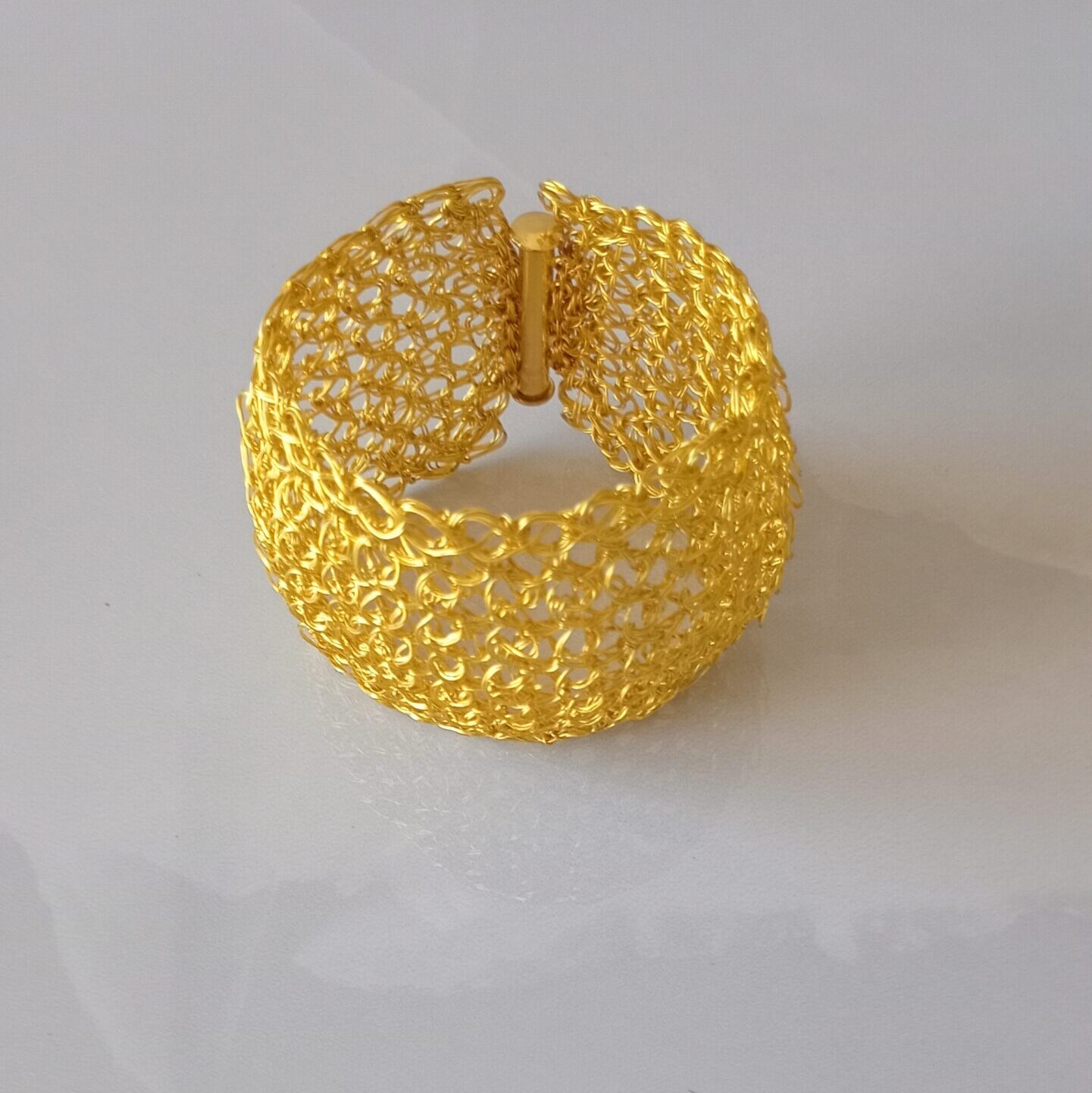 Bracciale in rame placcato in oro di forma cilindrica a maglia larga con chiusura a scomparsa, dallo stile originale ed esclusivo, realizzato da sapienti mani artigianali. Il gioiello è splendido va indossato con disinvoltura aggiungendo eleganza alla tua personalità . Lunghezza 18 cm altezza 5 cm – abbinabile con orecchini R0013 e anello A0014.