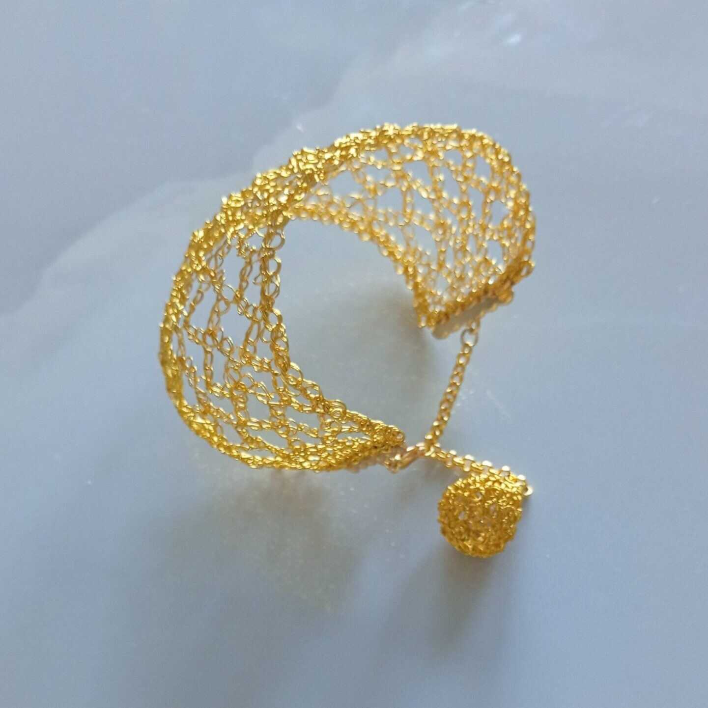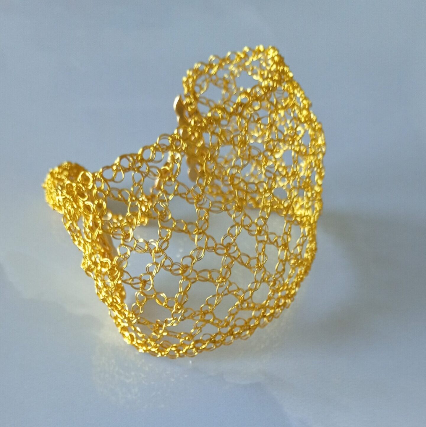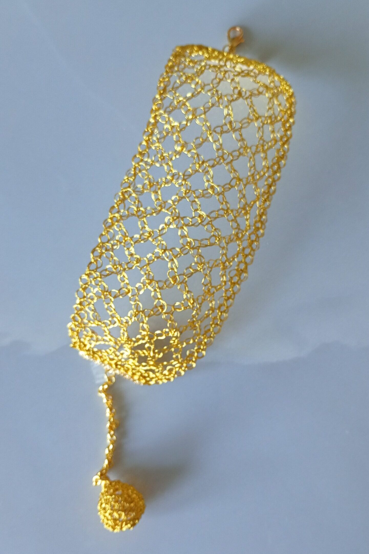 Bracciale in rame placcato in oro 14k di forma cilindrica a maglia larga con ciondolo chiusura a moschettone, dallo stile originale ed esclusivo, realizzato da sapienti mani artigianali. Il gioiello va indossato con disinvoltura aggiungendo eleganza alla tua personalità . Lunghezza 16 cm altezza 5,5 cm.