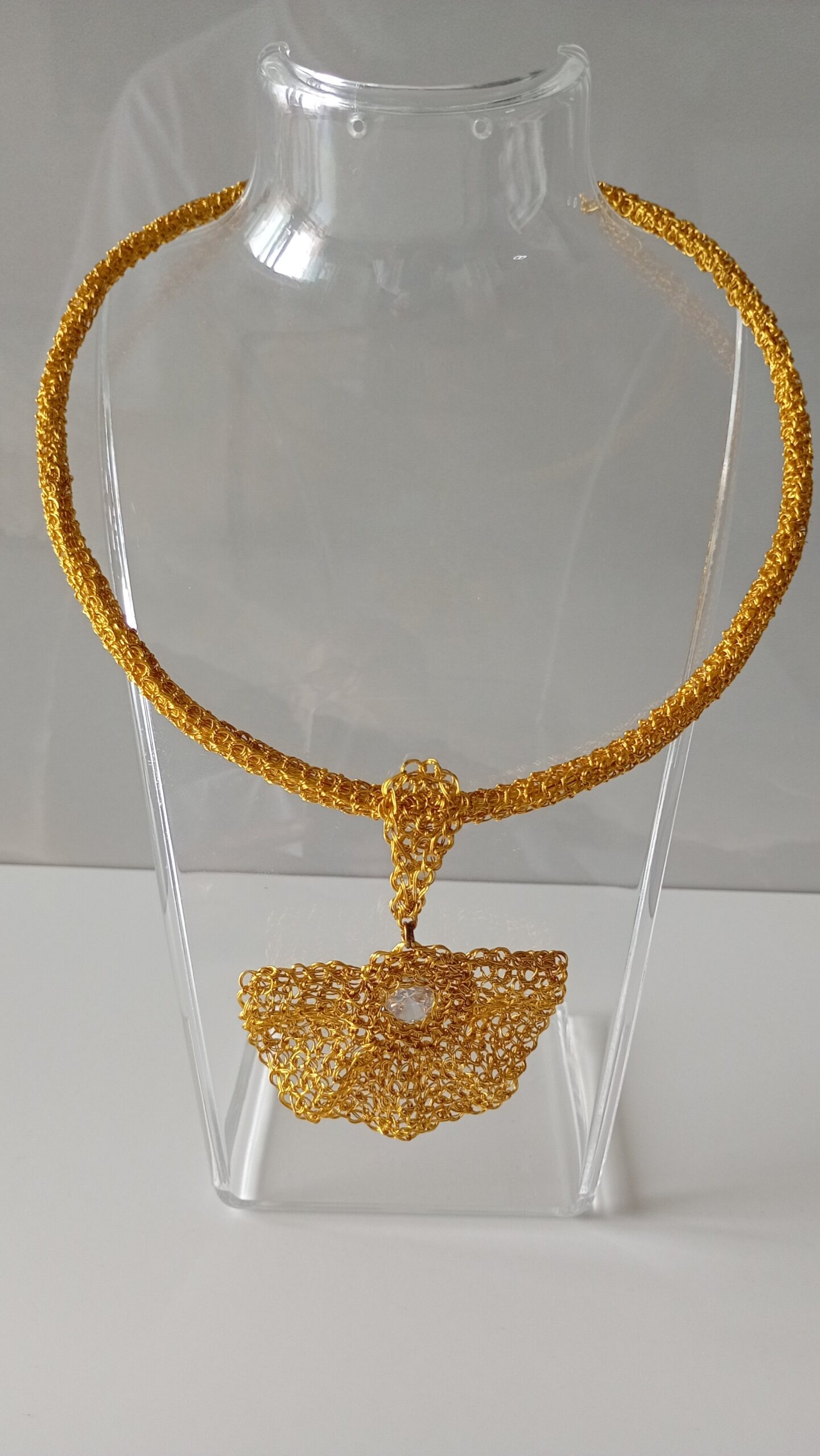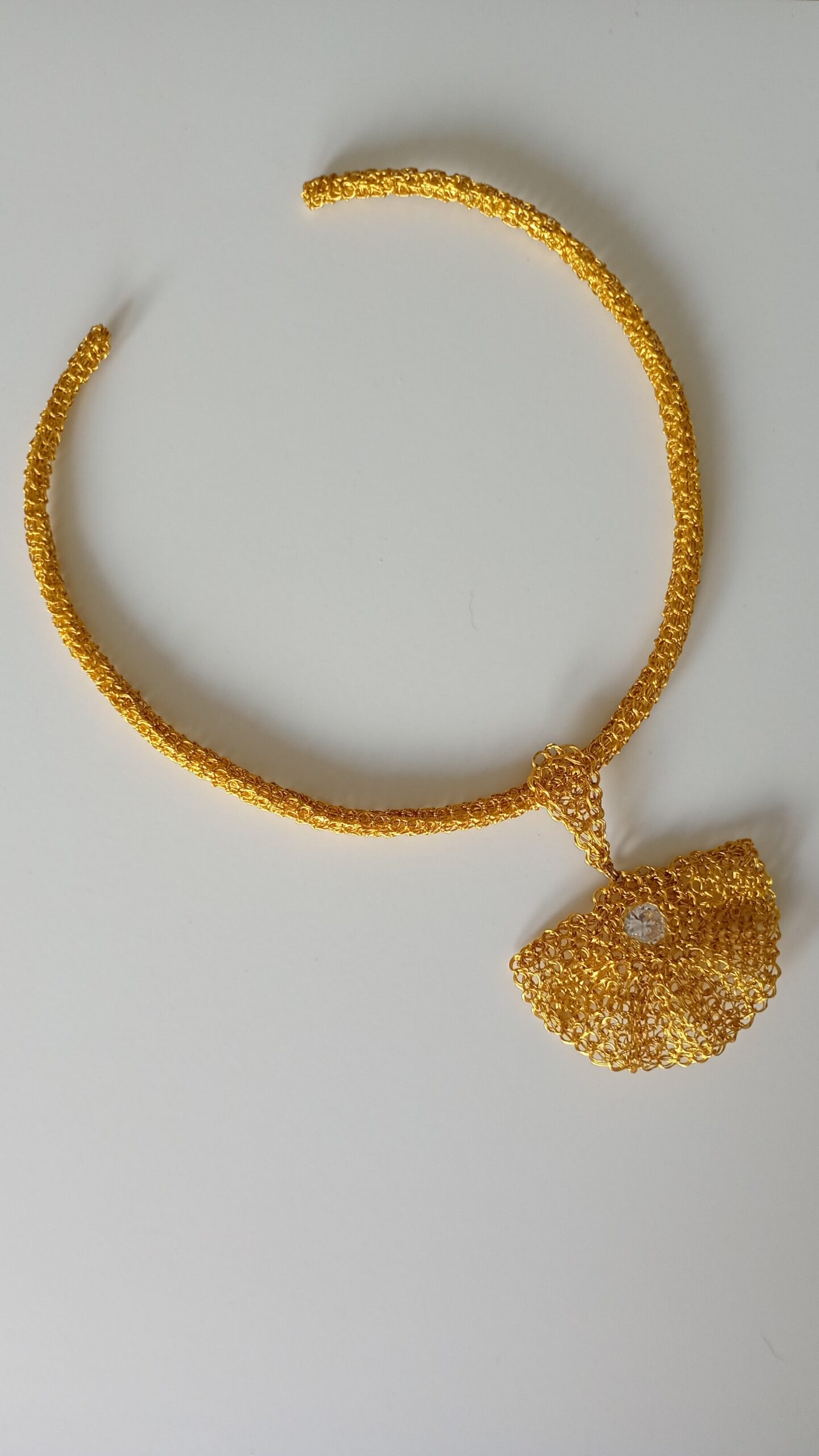 Collier in rame placcato in oro 14k con gemma di zirconia incastonata al centro del ventaglio ottenuto da una complessa lavorazione di sapienti mani artigianali, chiusura aperta. Il gioiello emana un’aura di lusso per aggiungere eleganza alla tua personalità . Lunghezza 40 cm – abbinabile con R0018.