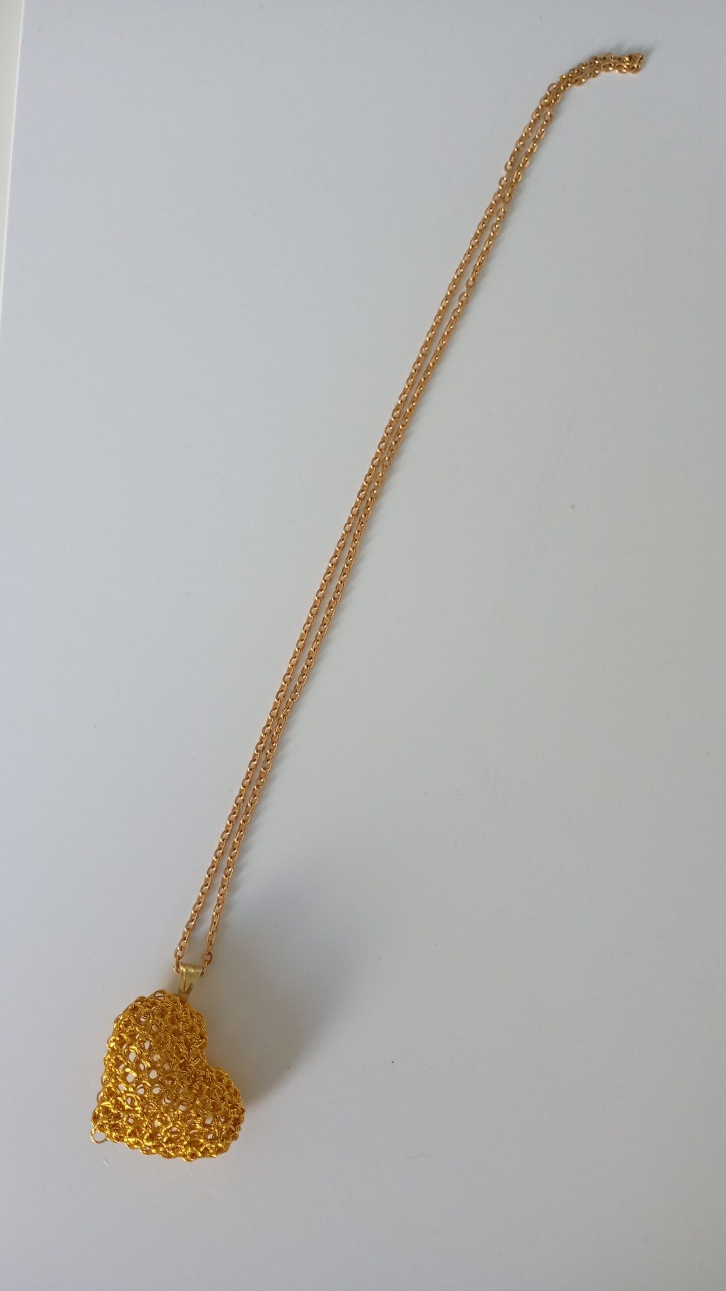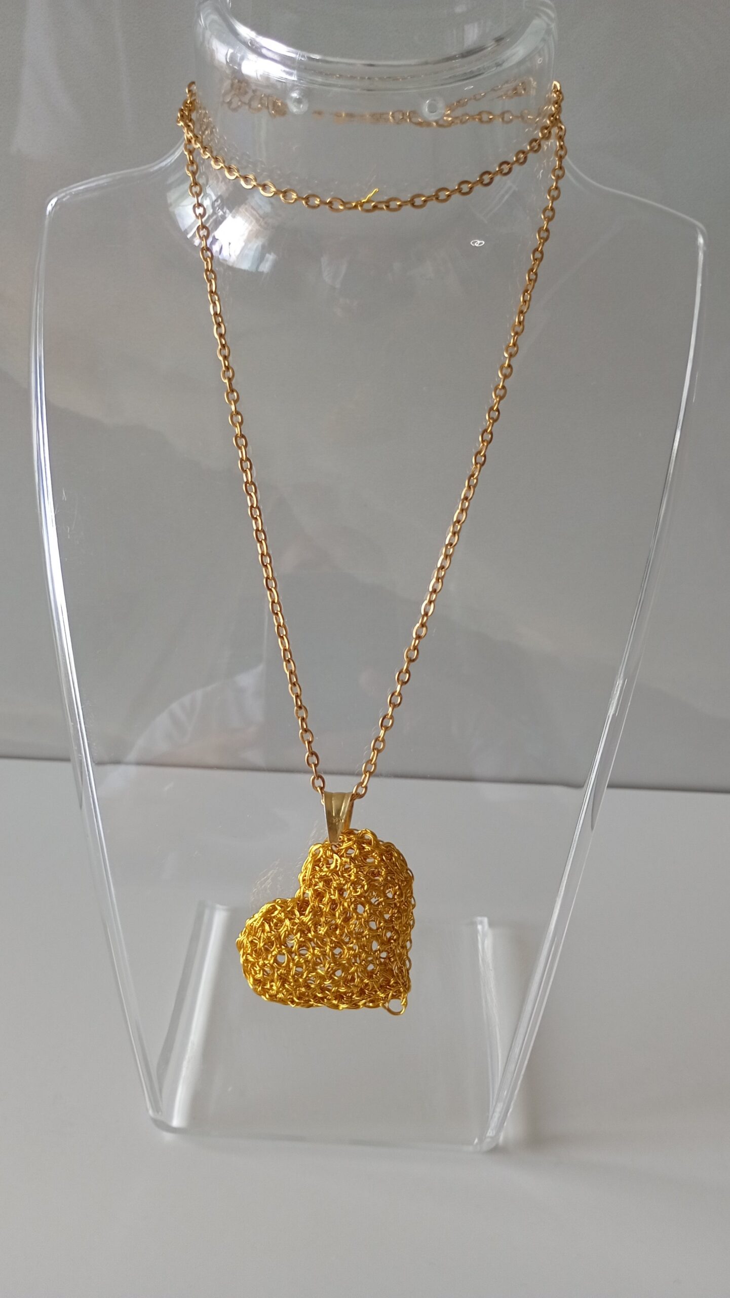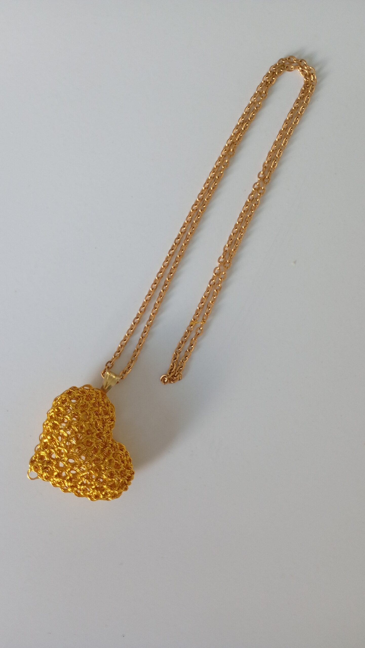 Collana in rame placcato in oro 14k chiusura ad anello con cuore tridimensionale ottenuto da una lavorazione complessa realizzata da sapienti mani artigianali. Il gioiello nella sua eleganza accentua la personalità di chi lo indossa. Lunghezza 50 cm – Abbinabile con orecchini R0014.