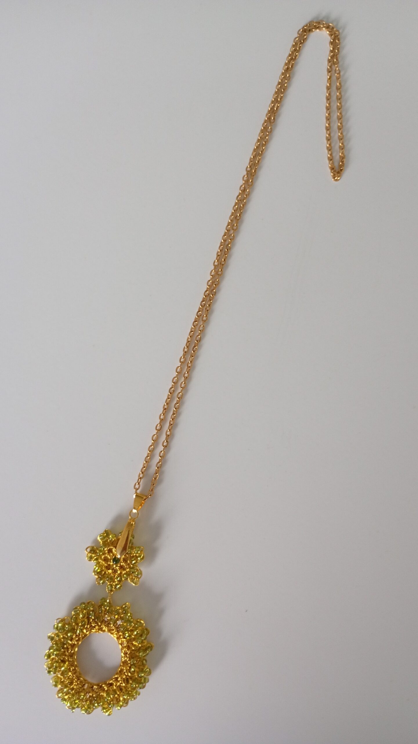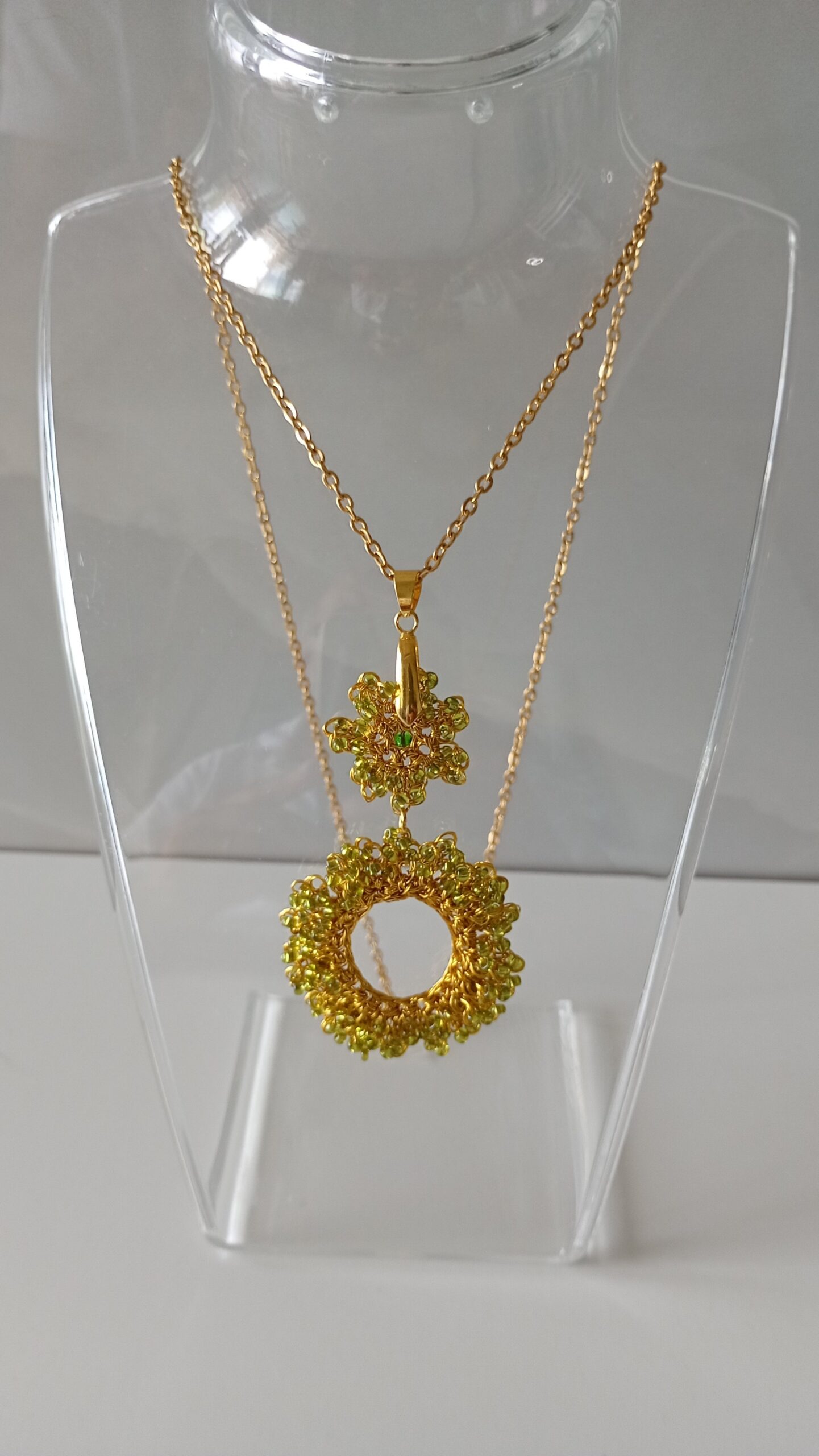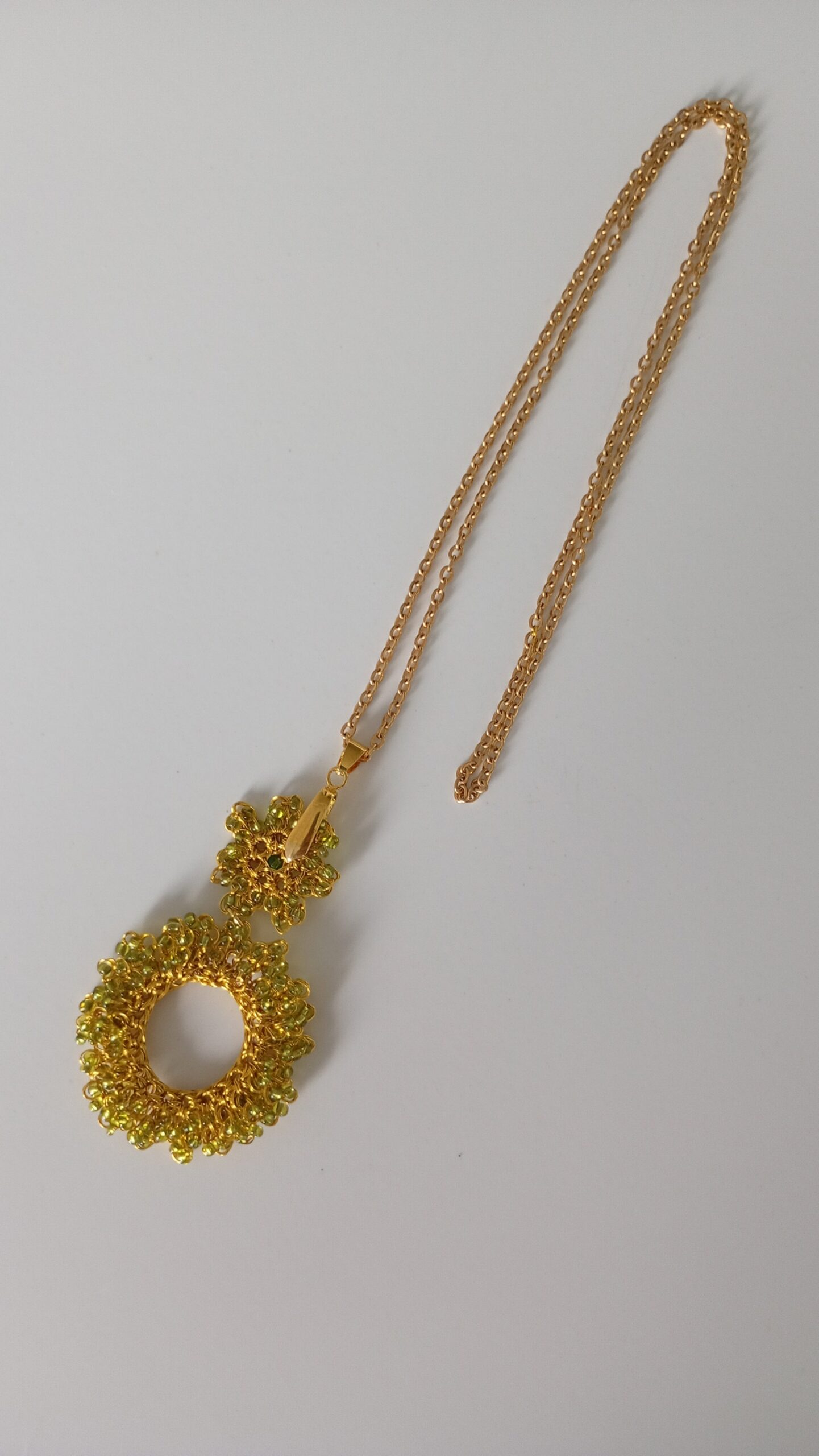 Collana in rame placcato in oro 14k a maglia grumetta solida ed elegante, medaglione e fiore con cristalli verdi, chiusura ad anello, realizzata da sapienti mani artigianali. Il gioiello è splendido va indossato con disinvoltura aggiungendo eleganza alla tua personalità. Lunghezza 45 cm.
