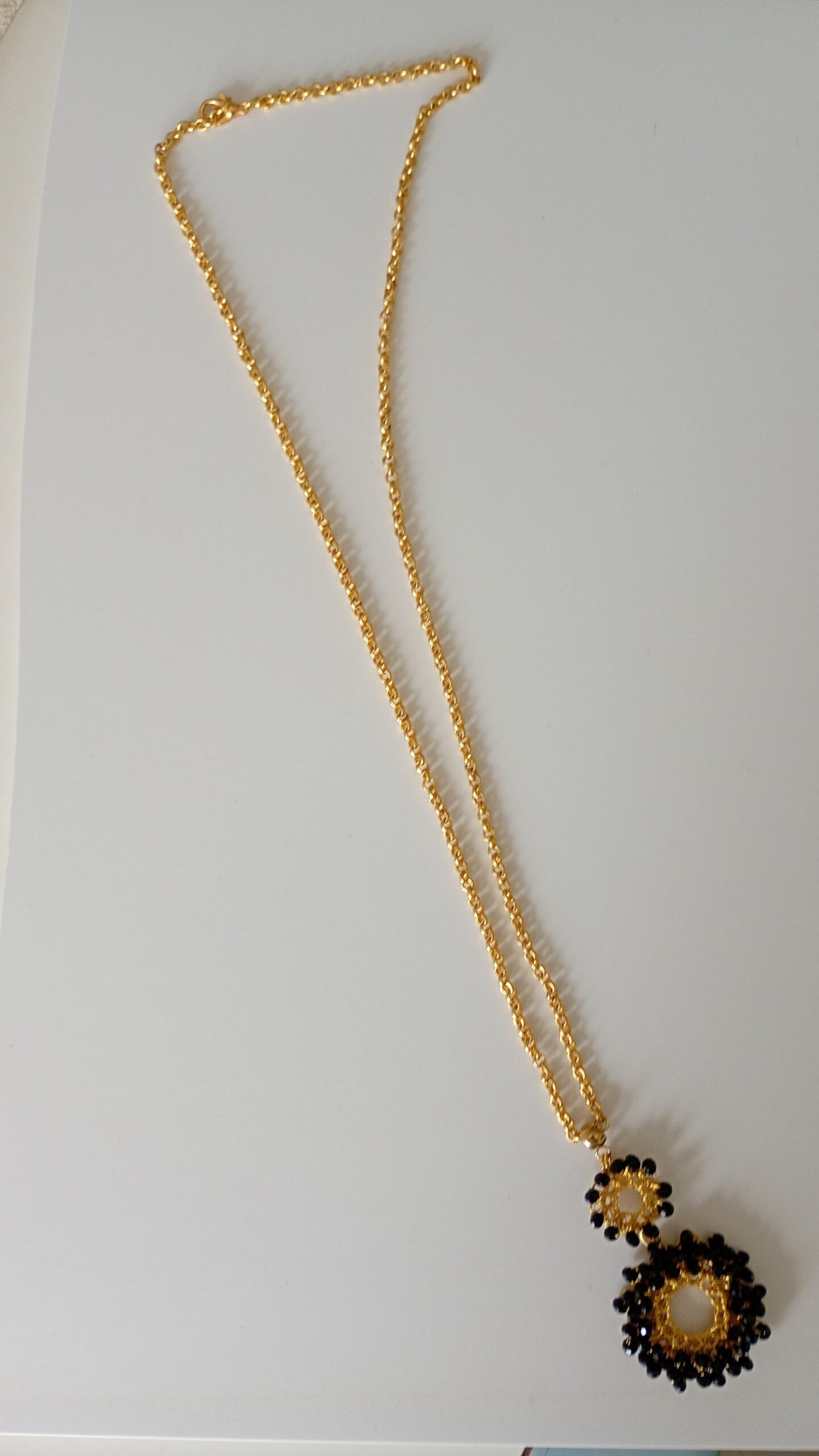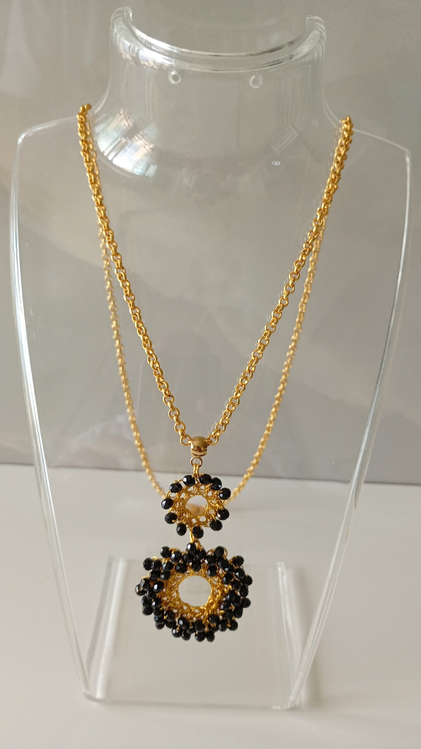 Collana, dallo stile originale senza tempo, in rame placcato in oro 14k a maglia rolò solida ed elegante, due medaglioni circolari con cristalli neri, chiusura a moschettone, realizzata da sapienti mani artigianali. Il gioiello è elegante va indossato con grazia per valorizzare la tua personalità. Lunghezza 60 cm – abbinabile con orecchini R0030.