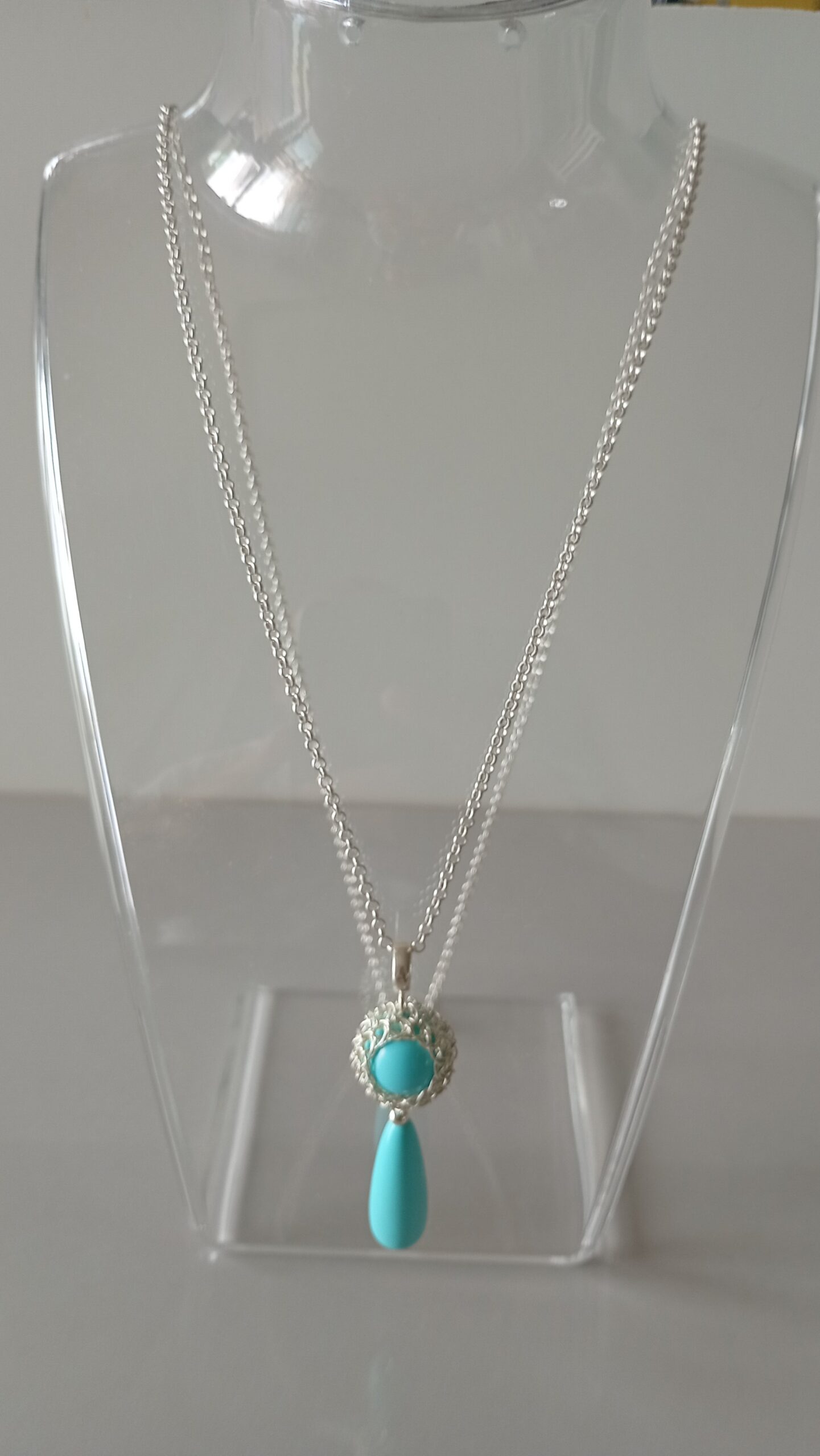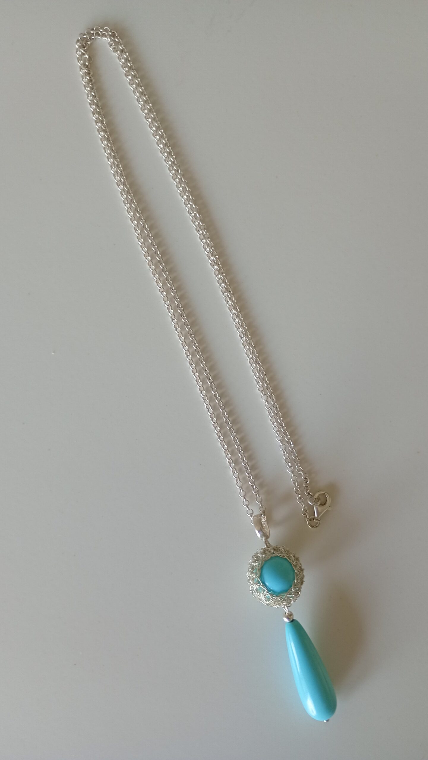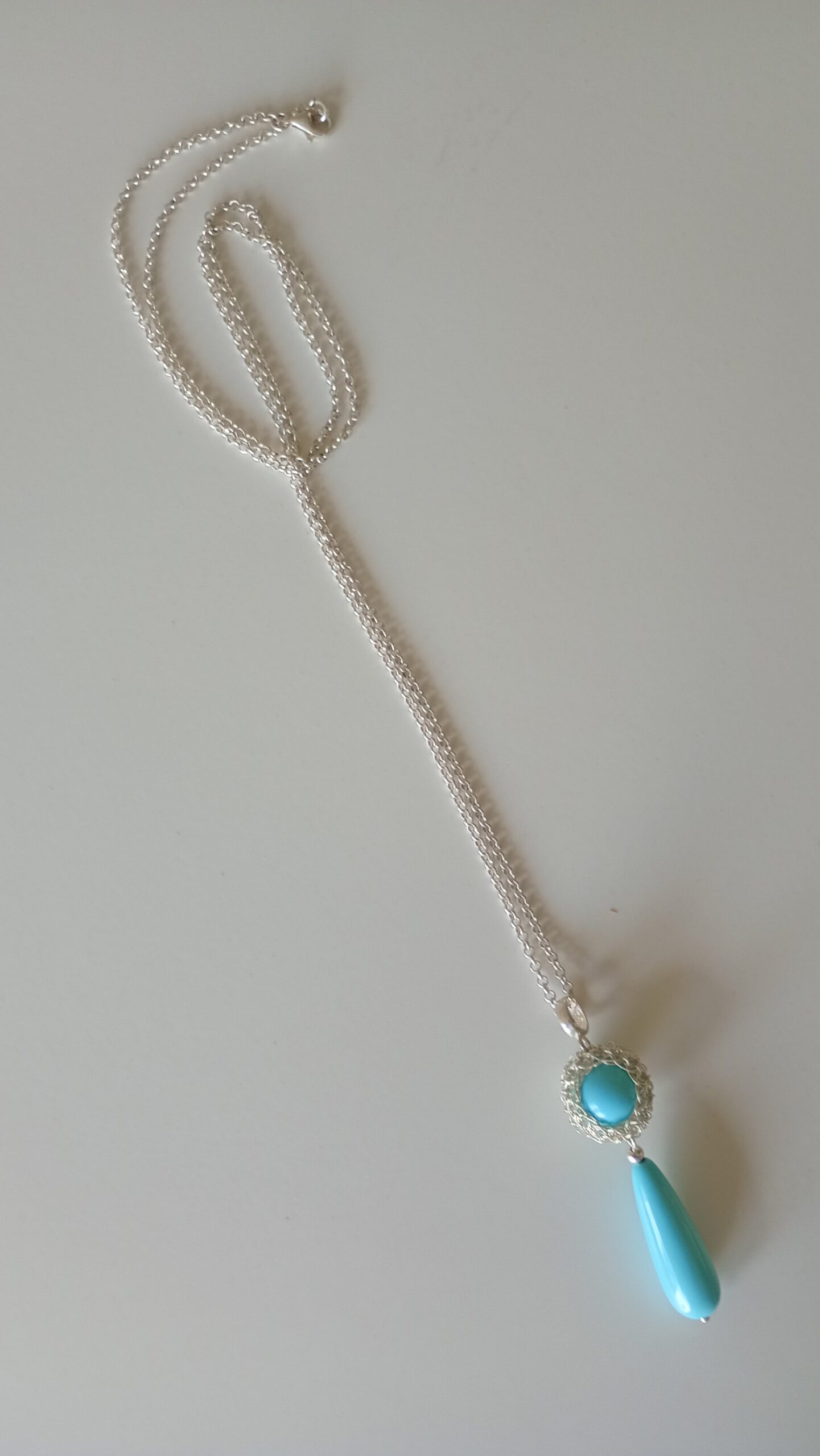 Collana a maglia rolo chain in argento 925 chiusura a moschettone con ciondolo e lacrima in perla di Maiorca colore turchese   un vero e proprio  “charm” dallo stile originale e giovanile, realizzato da sapienti mani artigianali. Il gioiello  va indossato con disinvoltura e fascino aggiungendo eleganza alla tua personalità. Lunghezza 65cm – abbinabile con anello A0008 orecchini R0010.