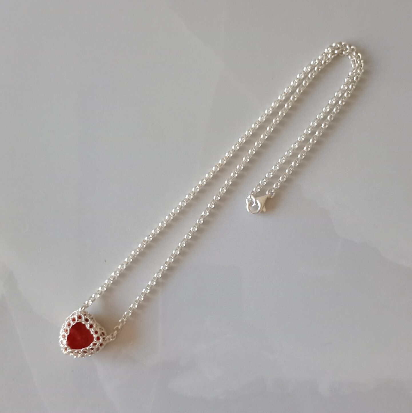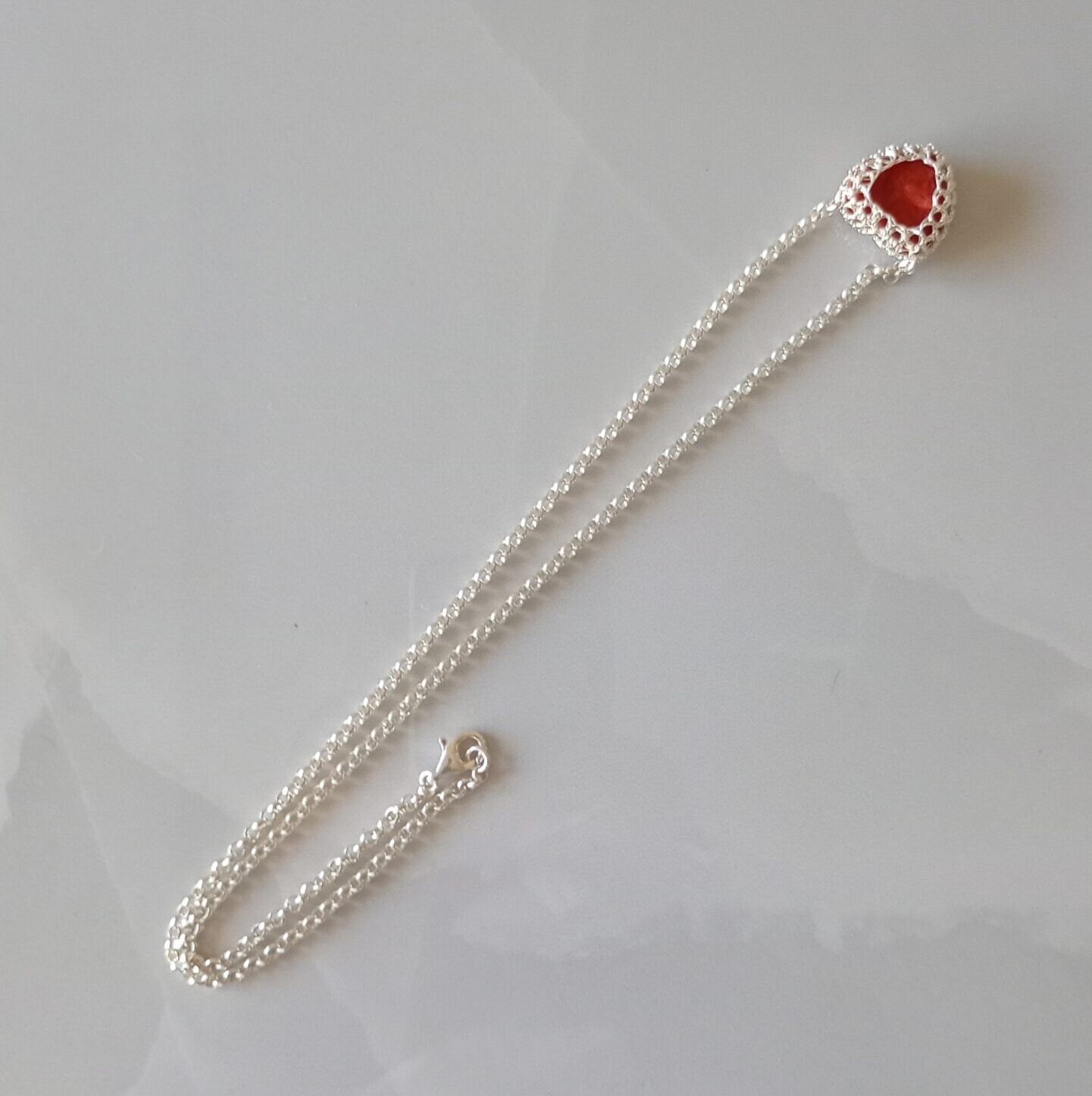 Collana in argento 925  dallo stile classico senza tempo che incastonano una pietra in pasta di corallo color rosso che ha il potere di migliorare l’autostima e stimolare la creatività, realizzati da sapienti mani artigianali. Il gioiello è splendido  va indossato con disinvoltura aggiungendo eleganza alla tua personalità. Lunghezza 54 cm – Abbinabile con orecchini…