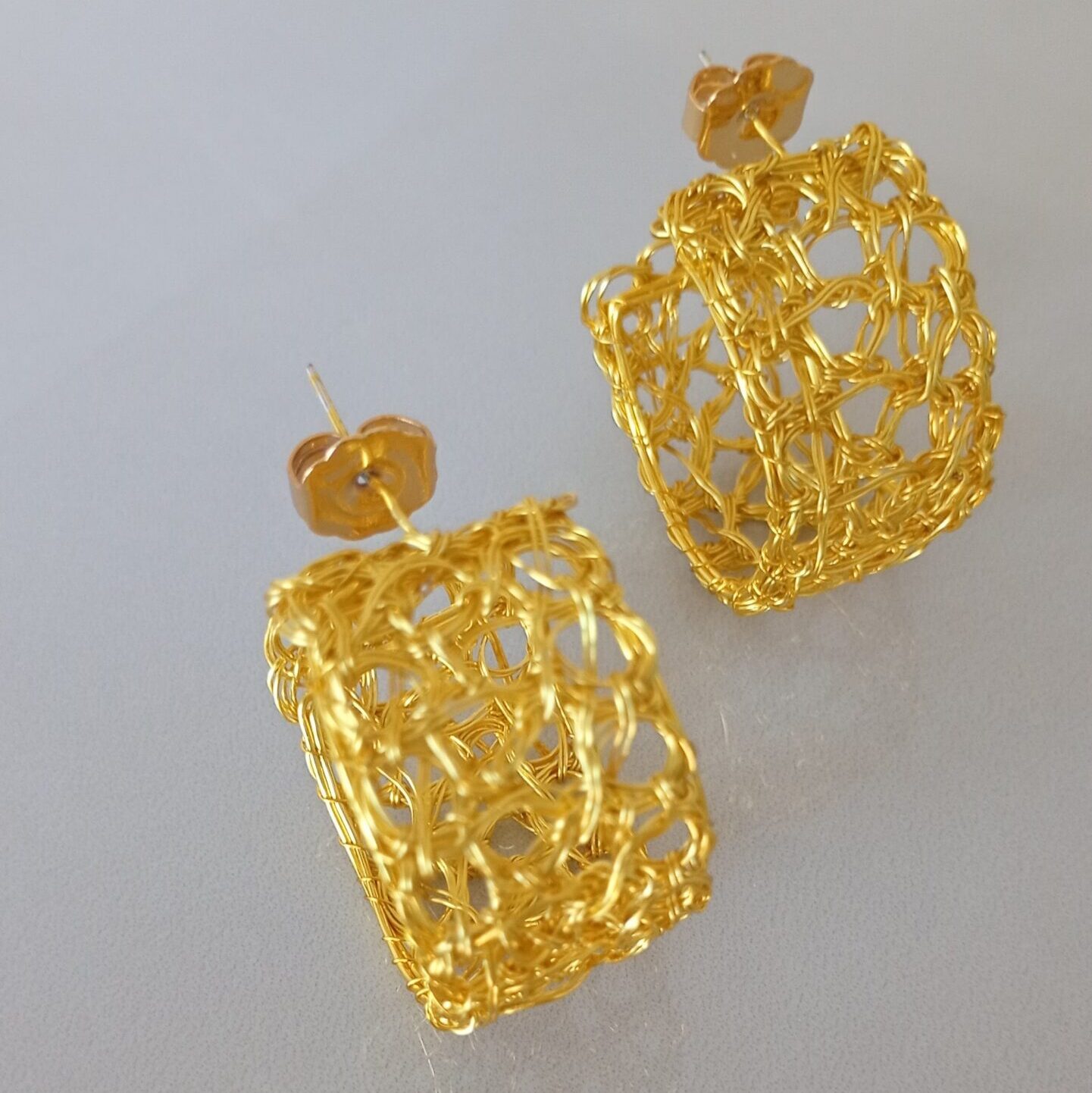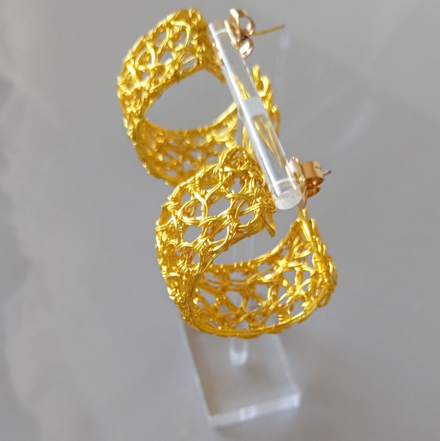 Orecchini in rame placcato in oro 14k di forma semi sferica a maglia larga con chiusura a push back, dallo stile originale ed esclusivo, lavorato da sapienti mani artigianali. Il gioiello è splendido va indossato con disinvoltura aggiungendo eleganza alla tua personalità . Lunghezza 18 cm altezza 5 cm – abbinabile con bracciale B0009 e orecchini R0013.