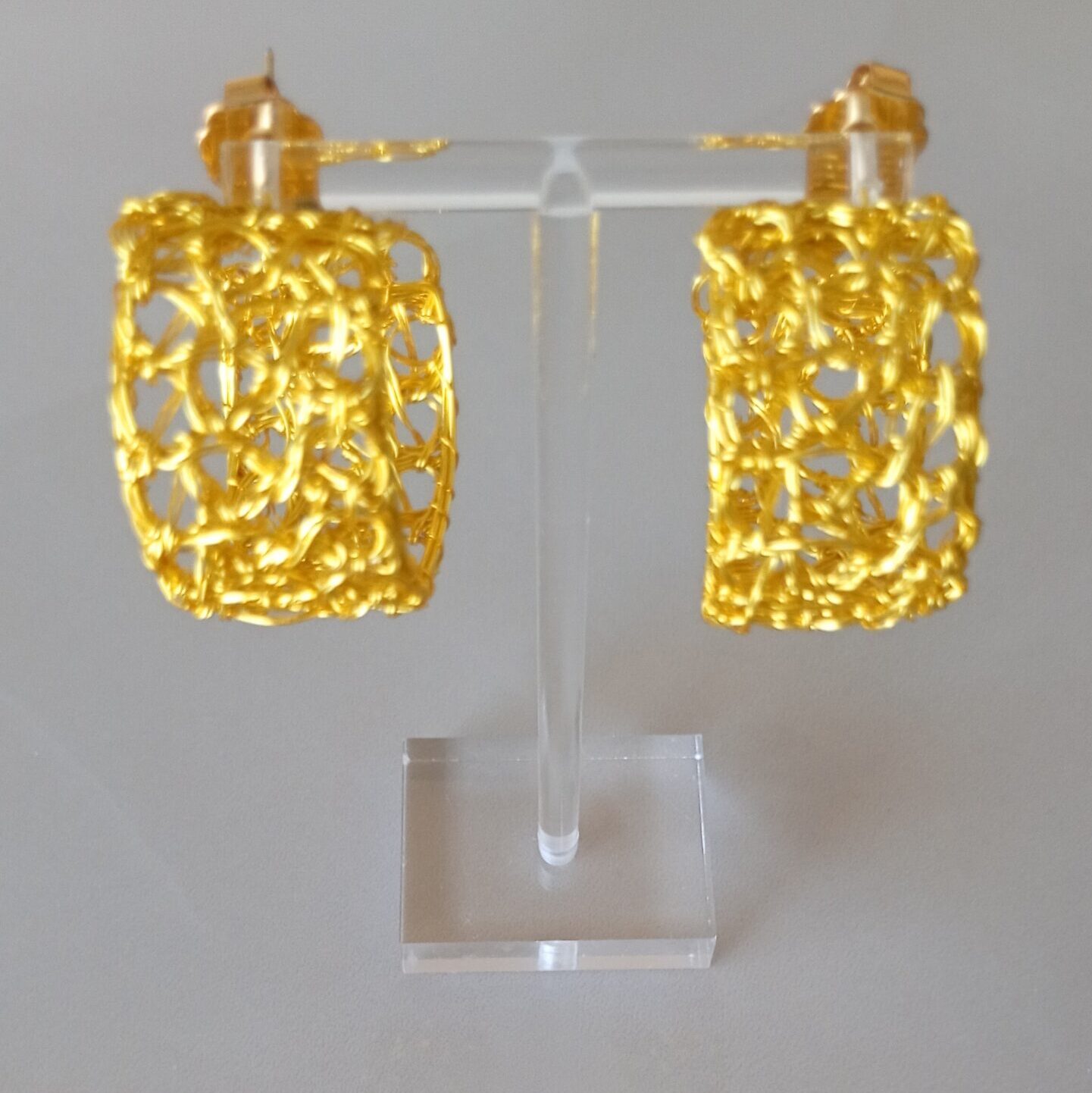 Orecchini in rame placcato in oro 14k di forma semi sferica a maglia larga con chiusura a push back, dallo stile originale ed esclusivo, lavorato da sapienti mani artigianali. Il gioiello è splendido va indossato con disinvoltura aggiungendo eleganza alla tua personalità . Lunghezza 18 cm altezza 5 cm – abbinabile con bracciale B0009 e orecchini…