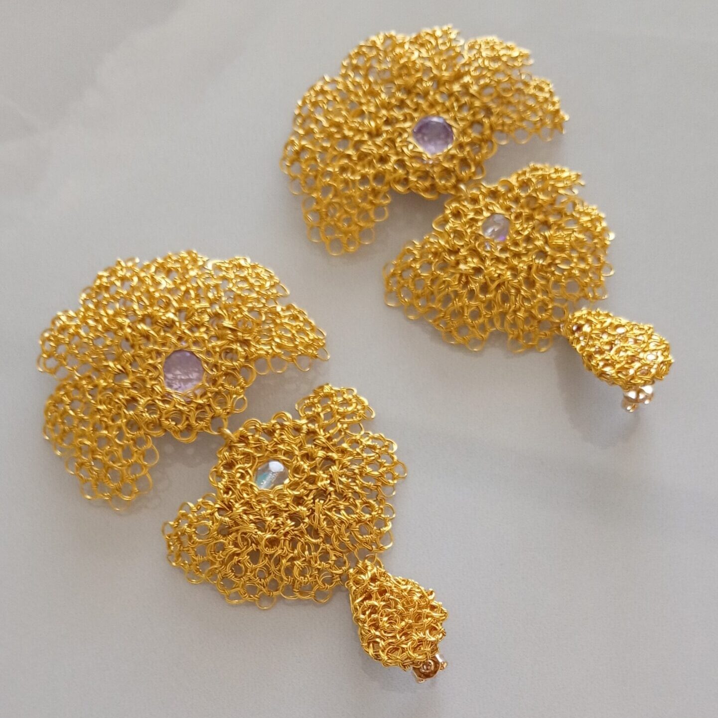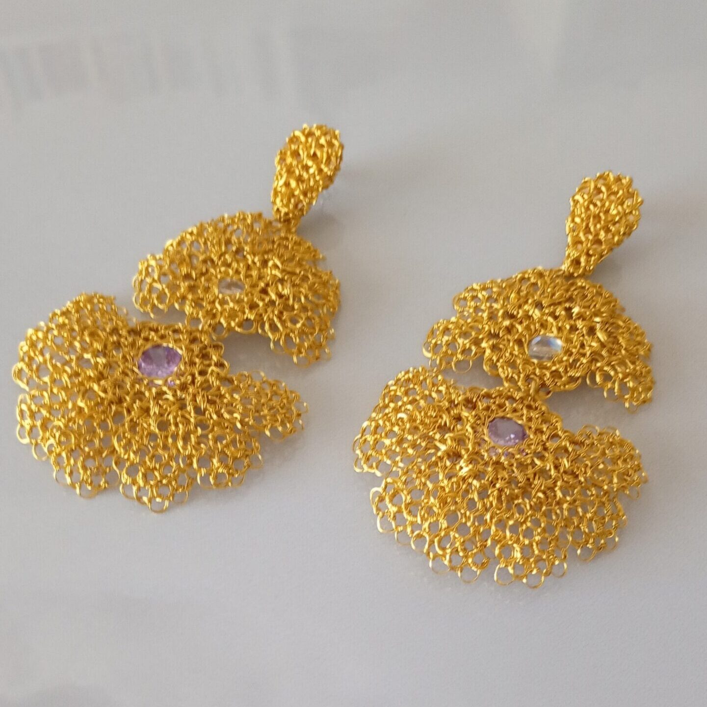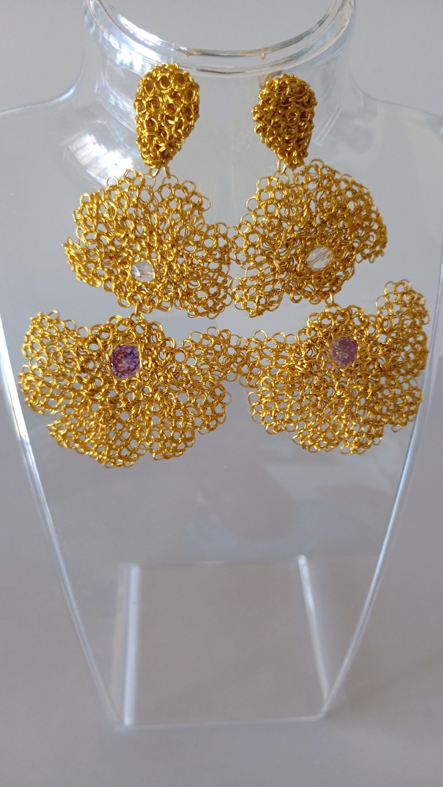 Orecchini pendenti  in rame placcato in oro 14k con  zirconie colore lilla e incolore incastonate in questo particolare fiore dorato dallo stile unico, realizzati da sapienti mani artigianali.  Il gioiello è splendido  va indossato con disinvoltura aggiungendo eleganza alla tua personalità. 3mm profondità, 90mm altezza,  larghezza 40-50mm – abbinabile con collana C0003.