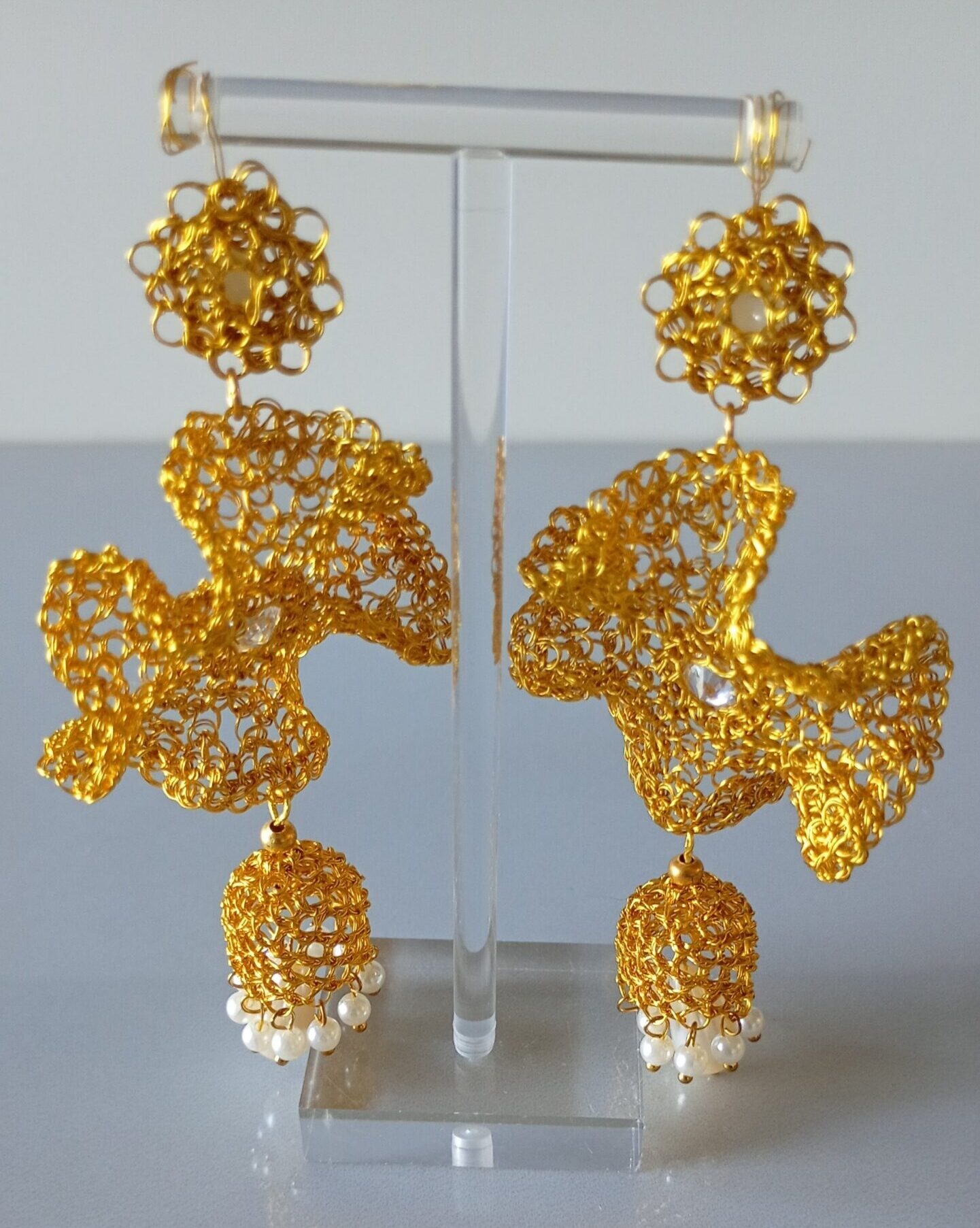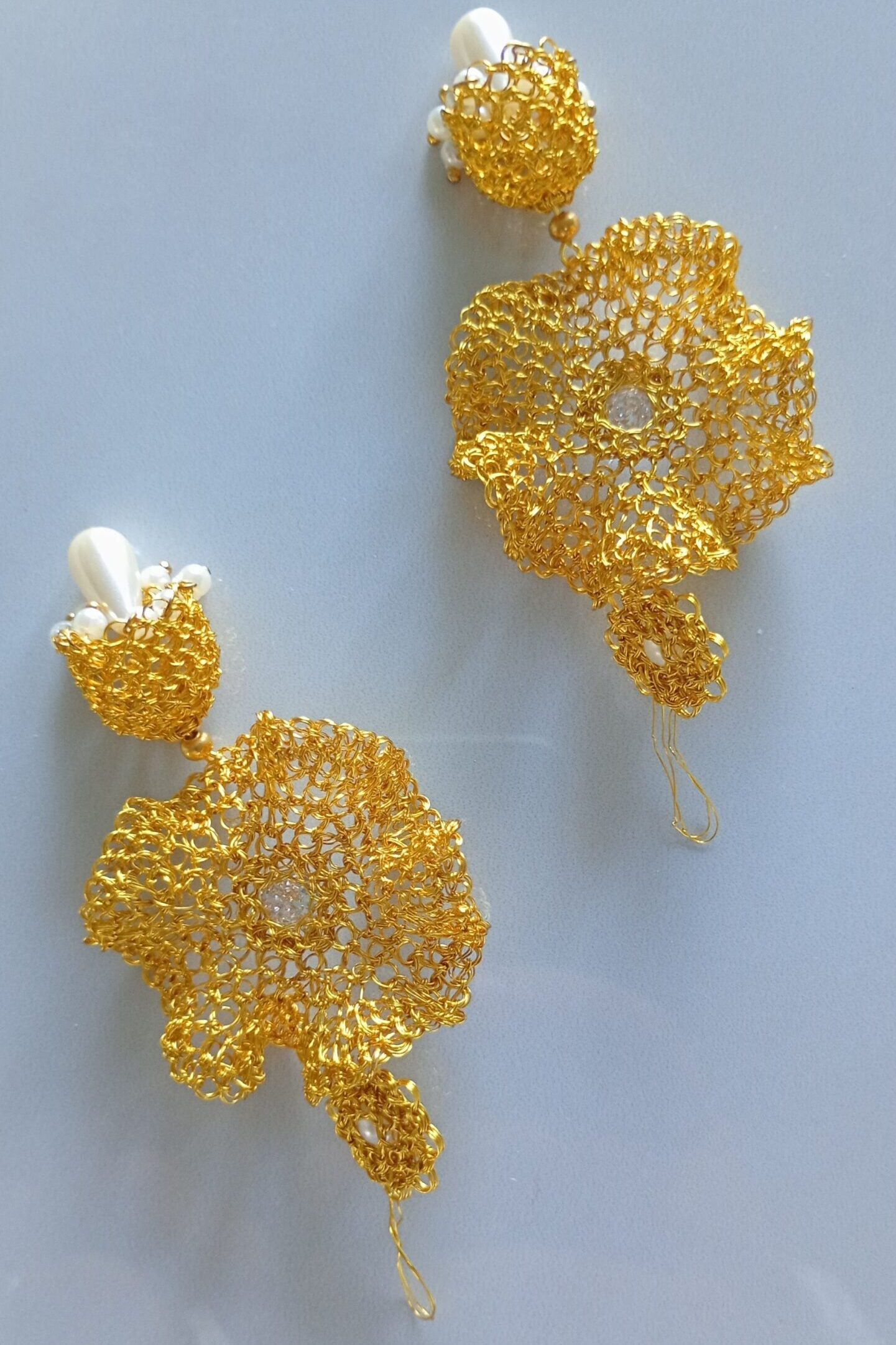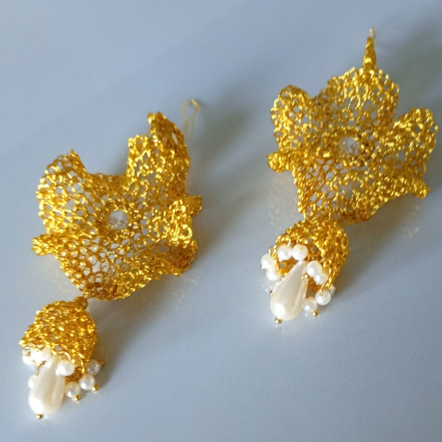 Orecchini pendenti in rame placcato in oro 14k con zirconia incolore incastonata al centro del fiore con sottostante elemento a goccia con perla artificiale e perline, realizzati da sapienti mani artigianali. Il gioiello è bellissimo va indossato con disinvoltura aggiungendo eleganza alla tua personalità. 2mm profondità, 90mm altezza, larghezza 40-10mm – abbinabile con collana C0004.…