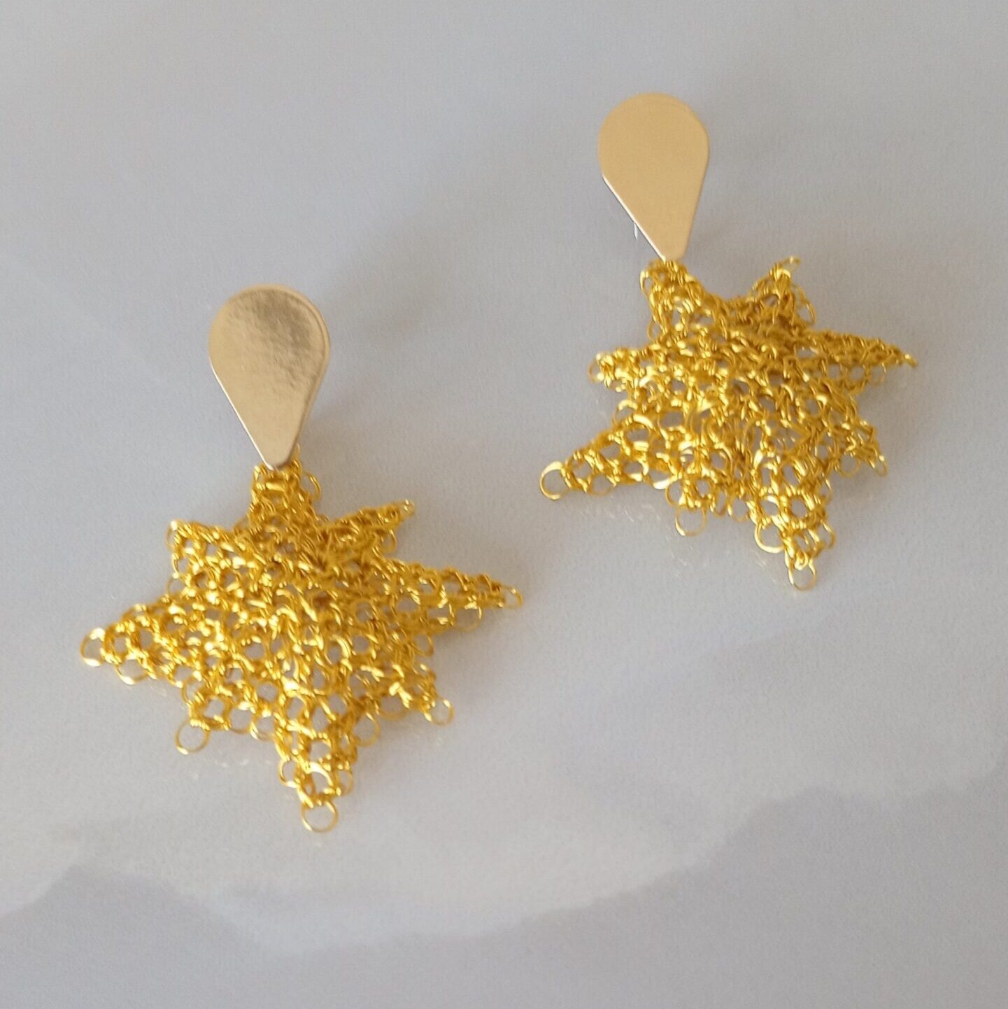 Orecchini pendenti in rame placcato in oro 14k a forma di stella dallo stile giovanile, realizzati da sapienti mani artigianali.  Il gioiello è unico va indossato con semplicità aggiungendo eleganza alla tua personalità . 2mm profondità , 55mm altezza, larghezza 45mm.