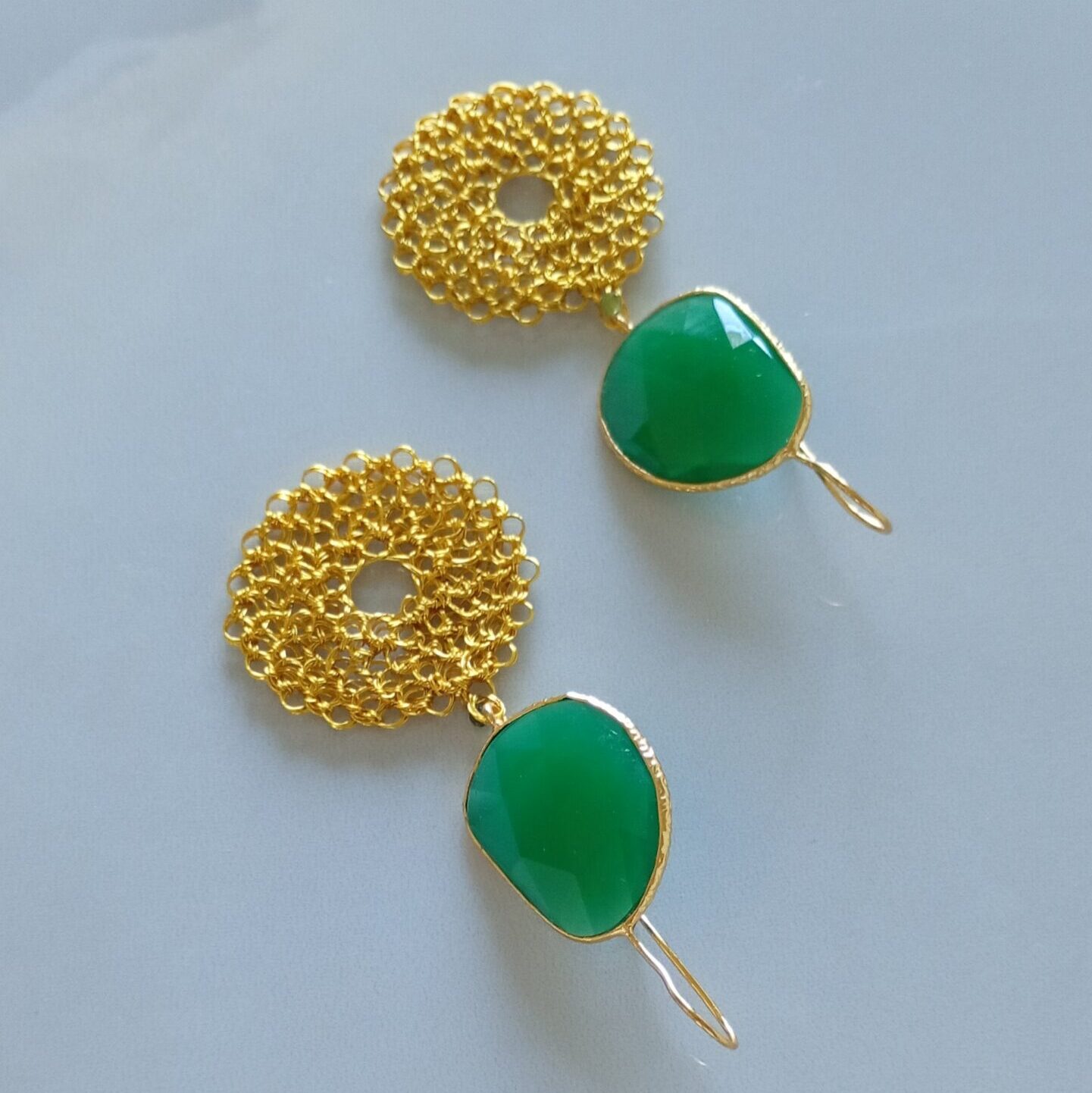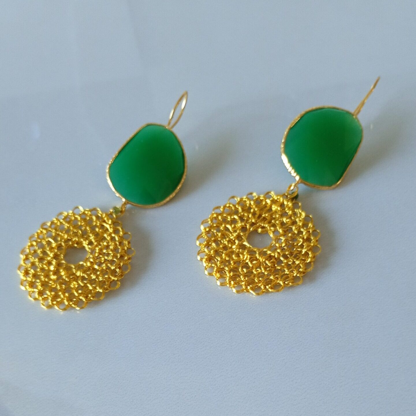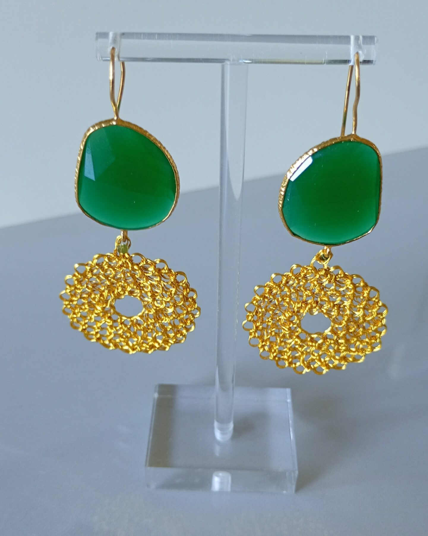 Orecchini pendenti bohémien in oro 14k, pietra in onice verde incastonata in una cornice a forma di cushion cutt, la parte inferiore circolare, lavorazione realizzata da sapienti mani artigianali. Il gioiello è splendido va indossato con disinvoltura aggiungendo eleganza alla tua personalità. 2mm spessore, altezza 80mm, larghezza 35mm.