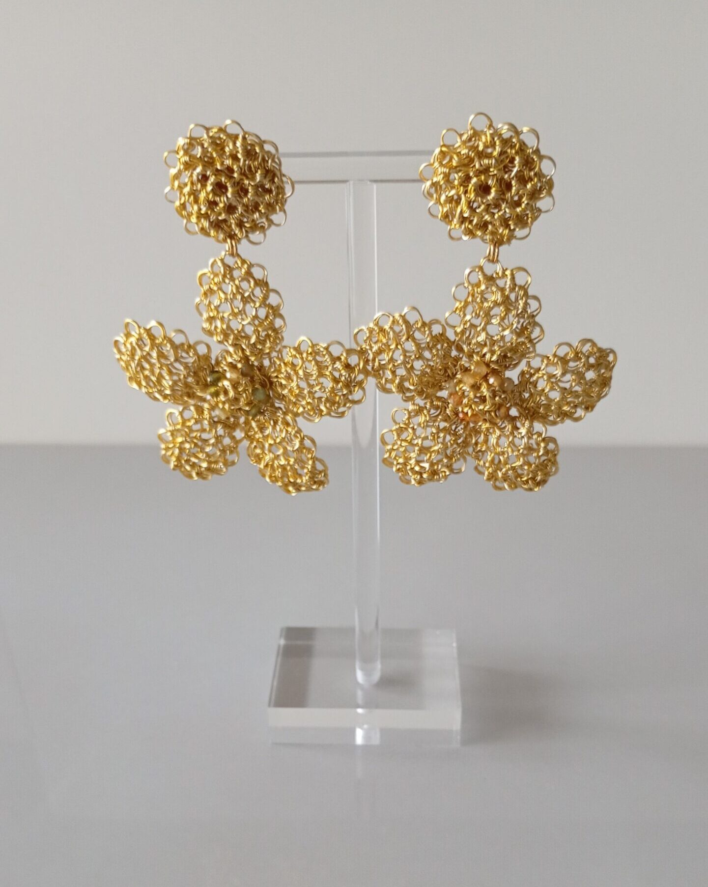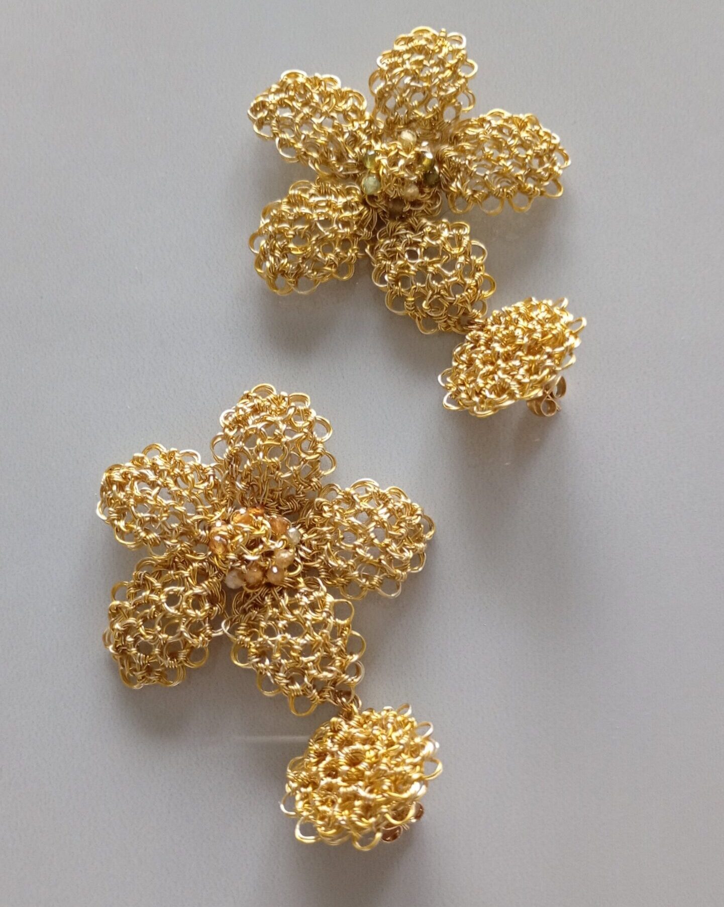 Orecchini pendenti in rame placcato in oro 14k a forma di fiore con al centro cristalli colorati, realizzati da sapienti mani artigianali. Il gioiello è unico va indossato con semplicità aggiungendo eleganza alla tua personalità. 2mm profondità, 55mm altezza, larghezza 45mm.