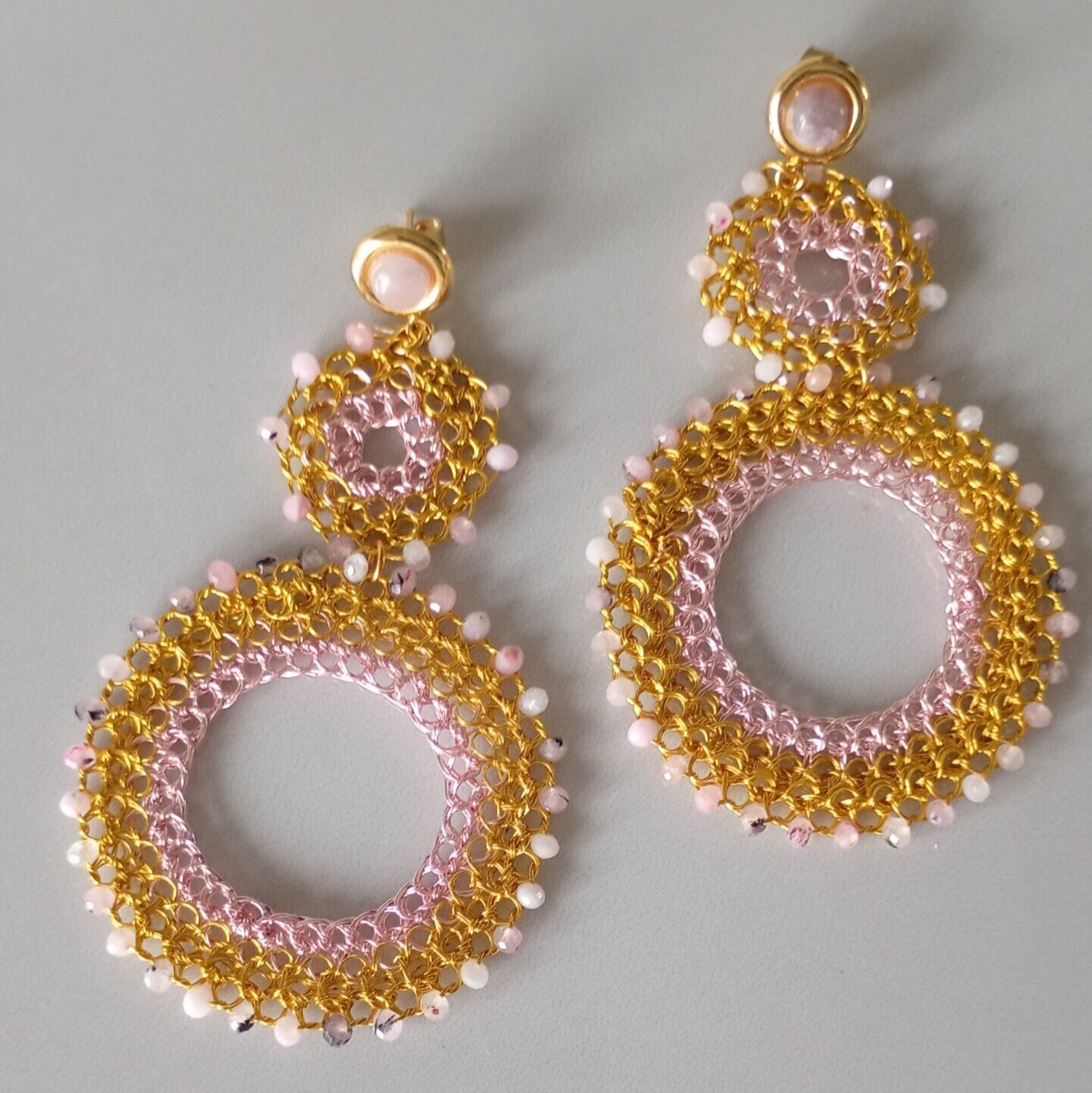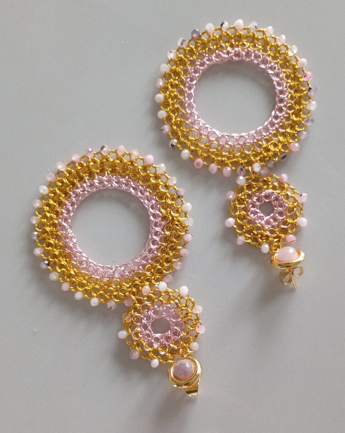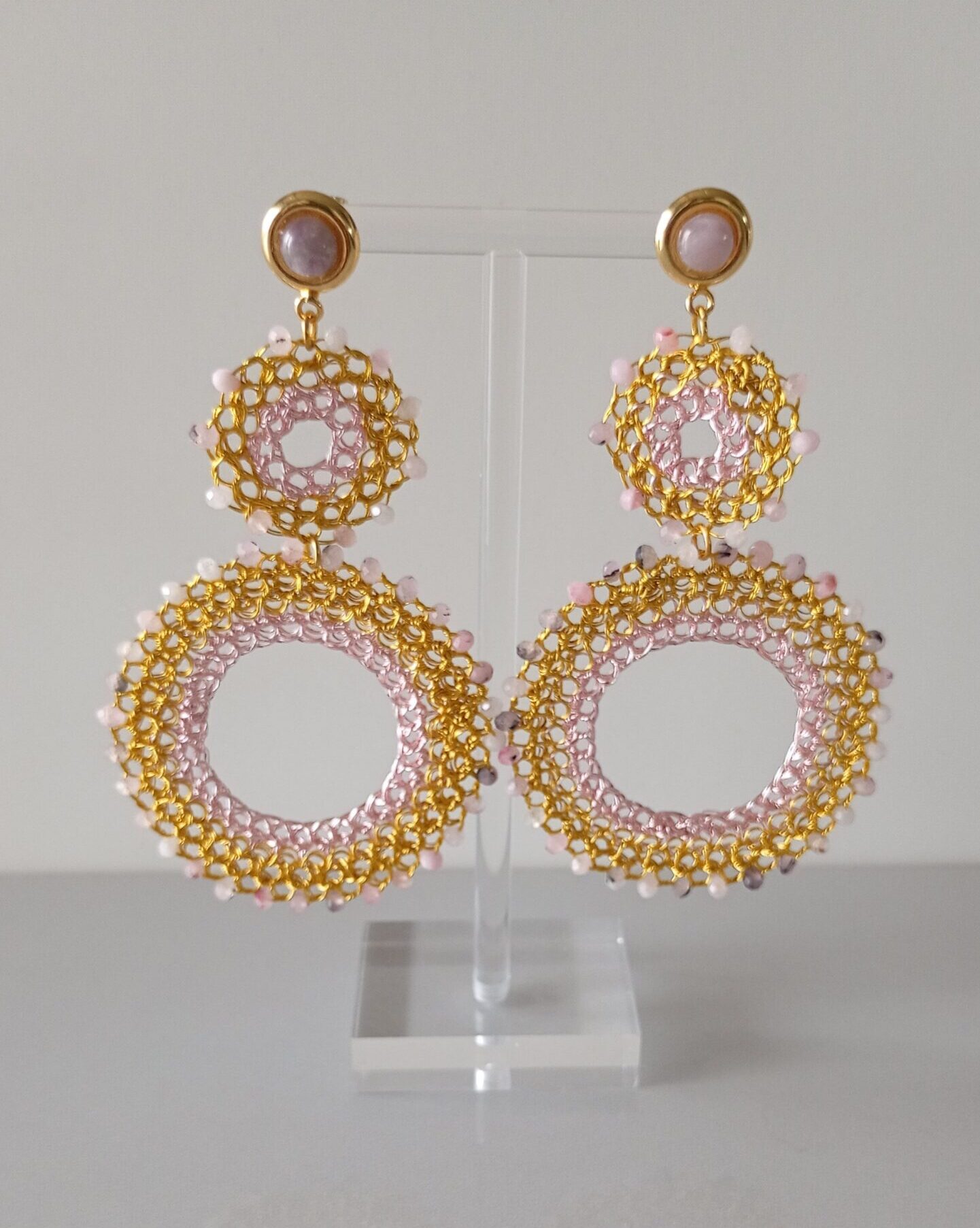 Orecchini bohémien a cerchi in rame placcato in oro 14k, filo rosa, cristalli naturali sfaccettati e pietra decorativa viola/grigio, realizzati da sapienti mani artigianali. Il gioiello è stupendo va indossato con disinvoltura aggiungendo senso artistico alla tua personalità. 2mm profondità, 85mm altezza, larghezza 25-45mm.