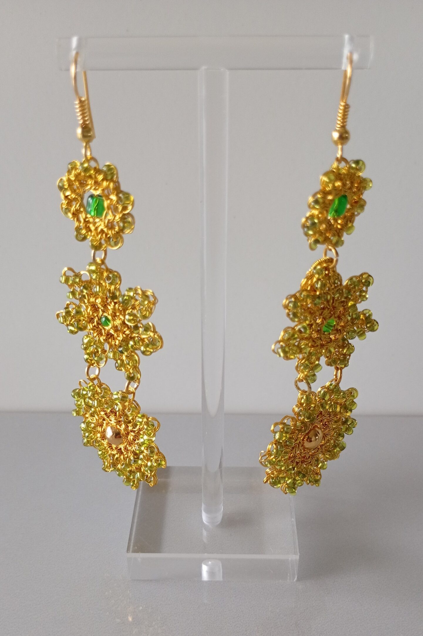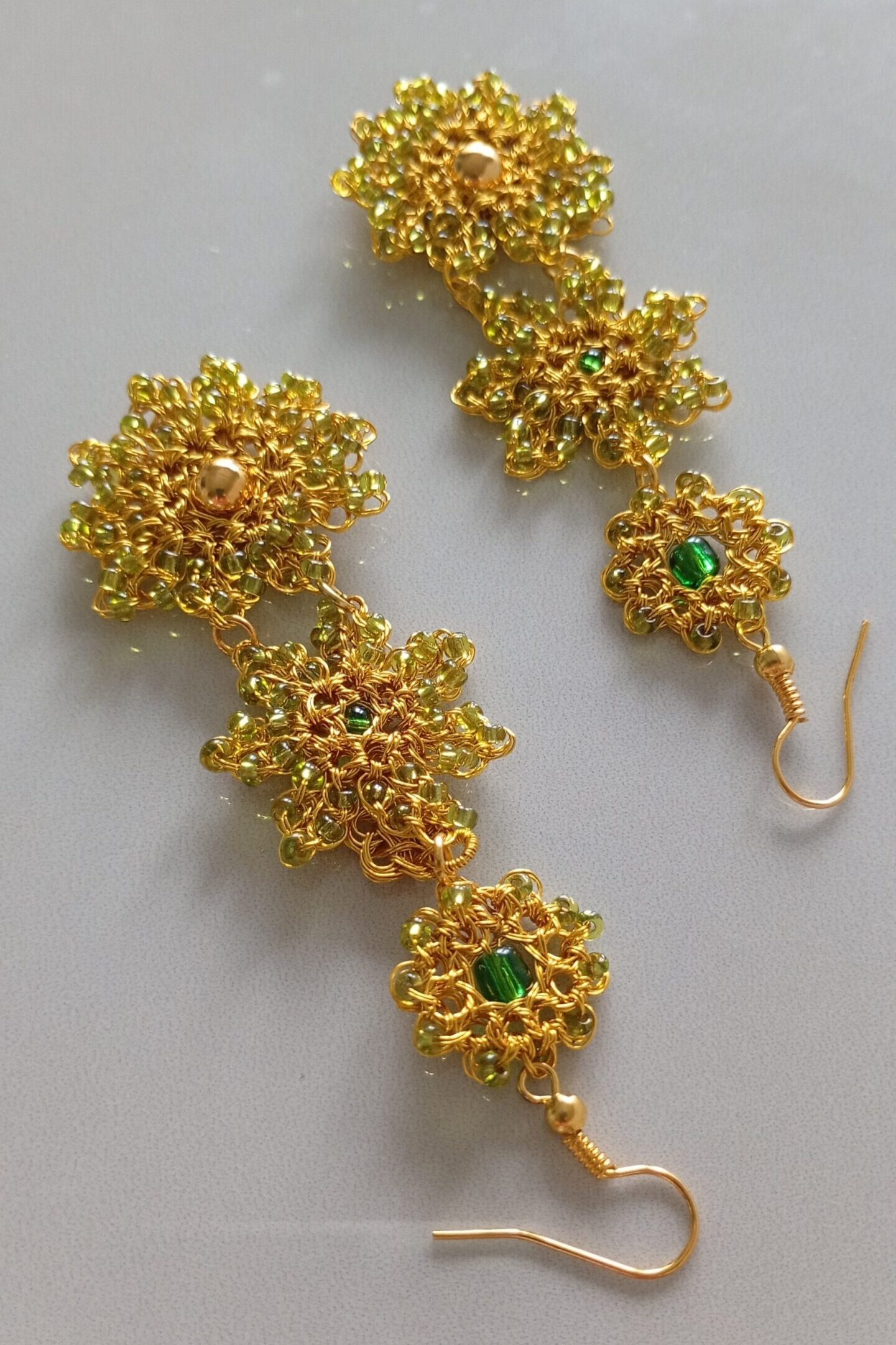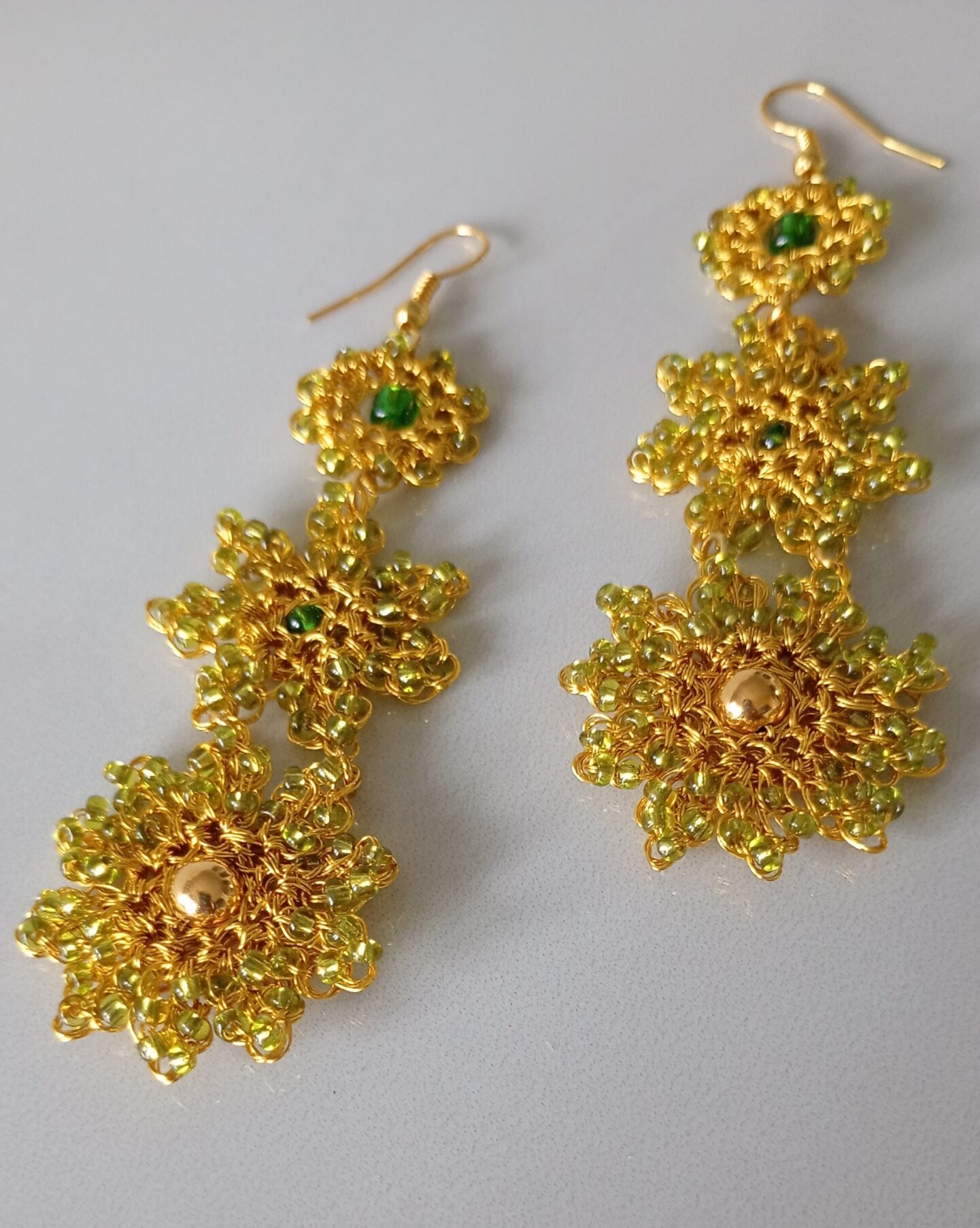 Orecchini pendenti  in rame placcato in oro 14k con cristalli verdi, perline e sfera incastonate nel fiore realizzati da sapienti mani artigianali.  Il gioiello è splendido  va indossato con disinvoltura aggiungendo eleganza alla tua personalità. 2mm profondità, 85mm altezza,  larghezza 25-40mm.