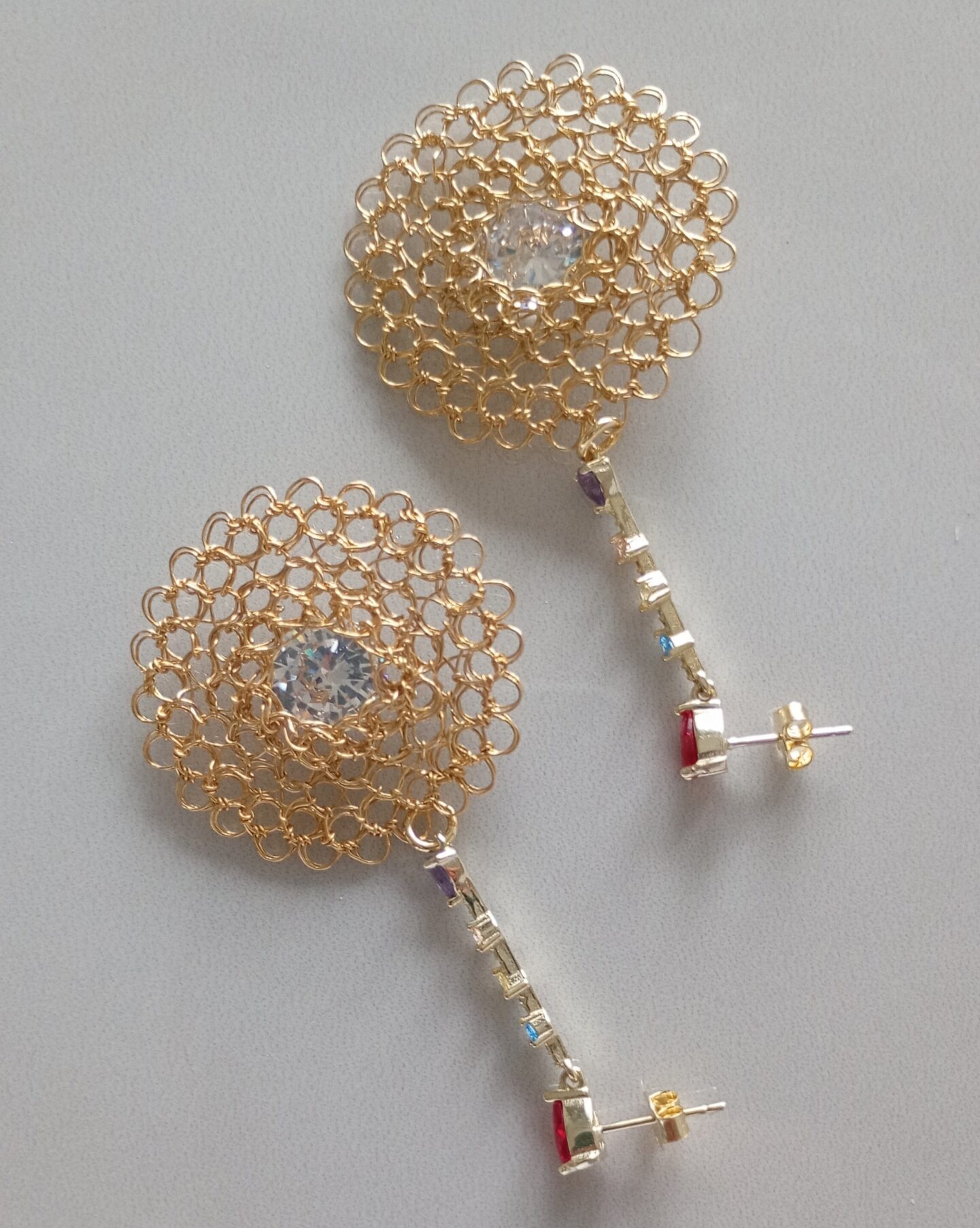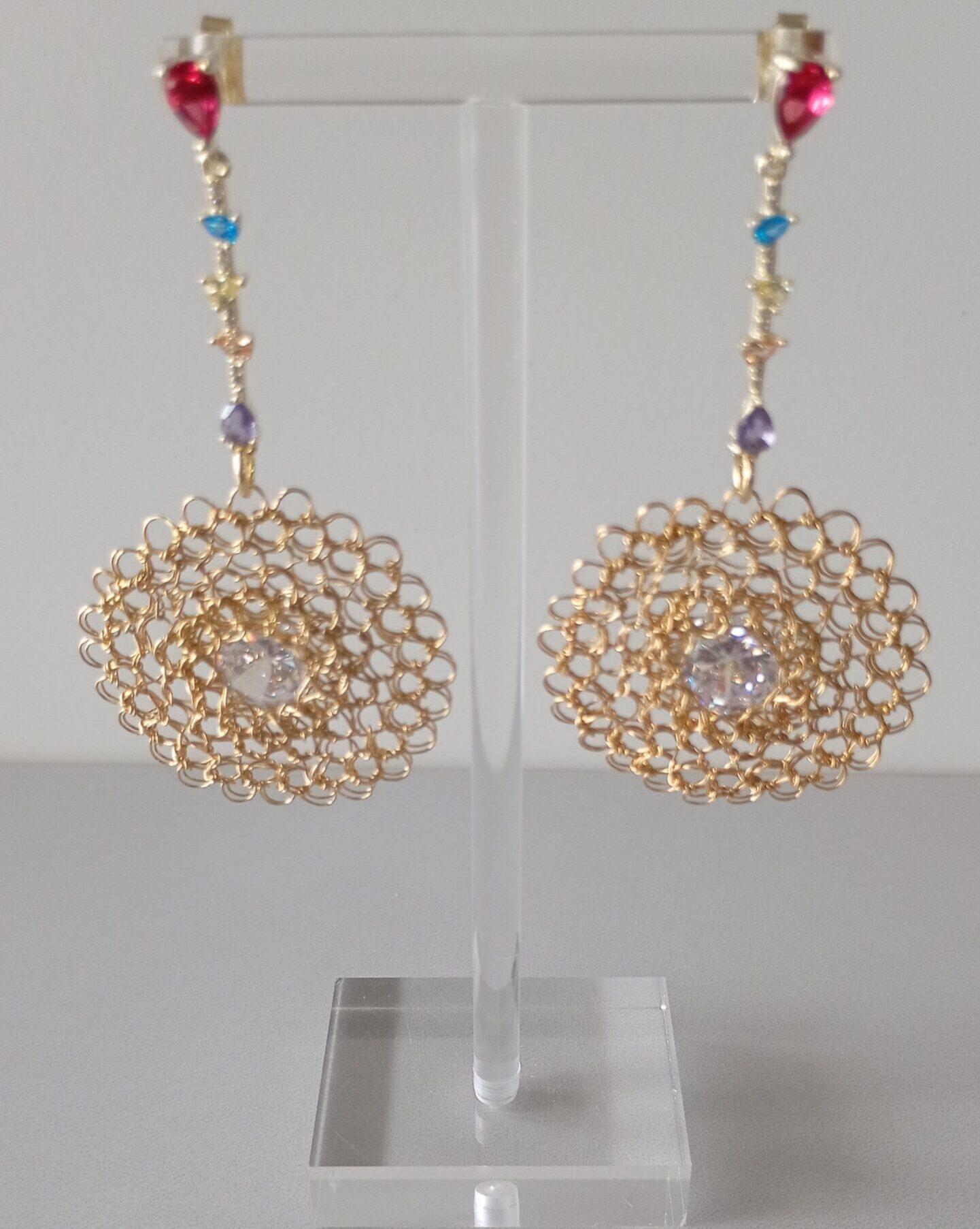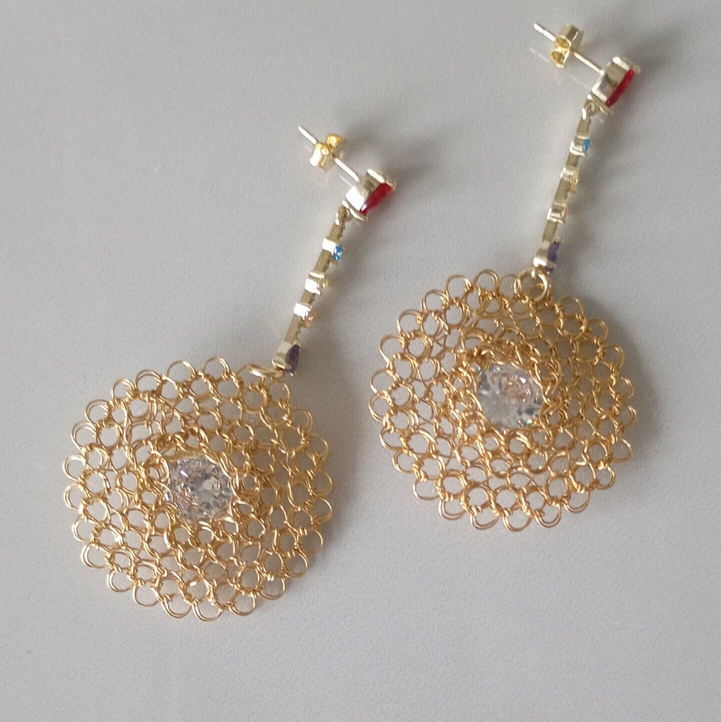 Orecchini pendenti a cerchio in rame placcato in oro 14k  con zirconia centrale trasparente  e dettagli decorativi di diversi colori in zirconia, realizzati da sapienti mani artigianali.  Il gioiello è unico esprime un’enfasi estetica ed espressione personale va indossato con charm valorizzando  la tua personalità. 2mm profondità, 60mm altezza, 35mm larghezza.