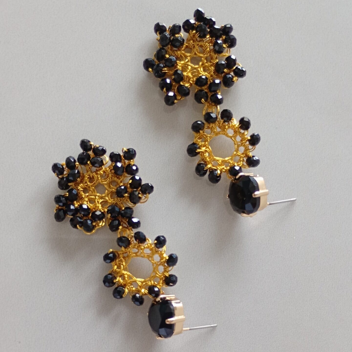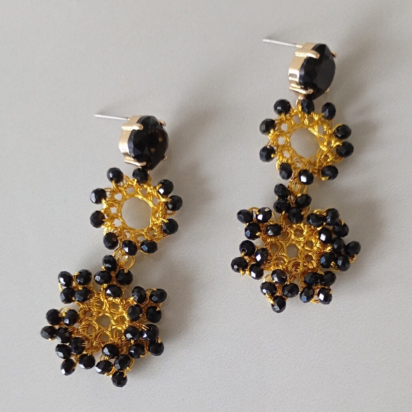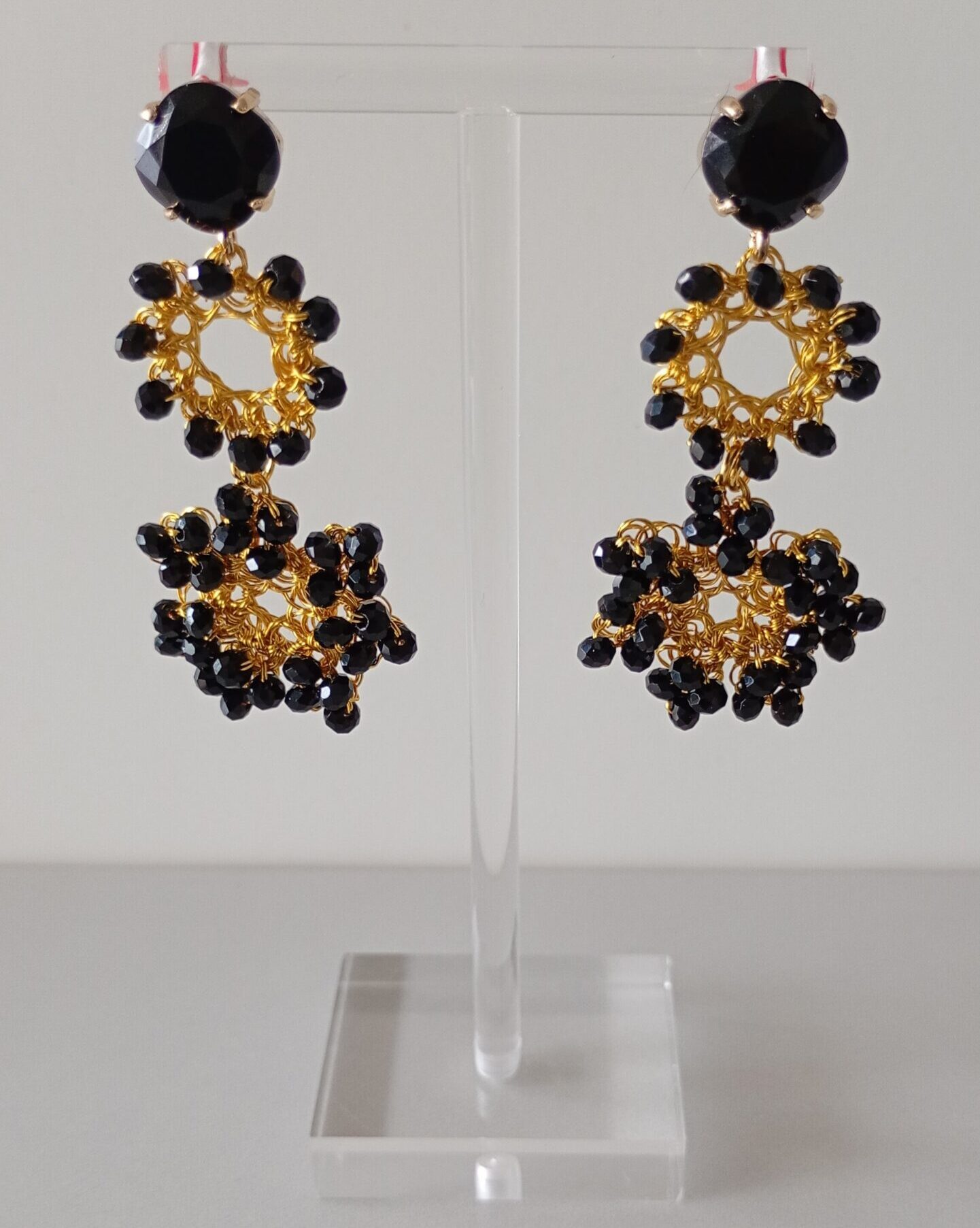 Orecchini pendenti a cerchi in rame placcato in oro 14k con cristalli neri, realizzati da sapienti mani artigianali. Il gioiello è stupendo va indossato con grazia aggiunge eleganza alla tua personalità. 3mm profondità, 55mm altezza, larghezza 15-25mm – abbinabile con Collana C0011.
