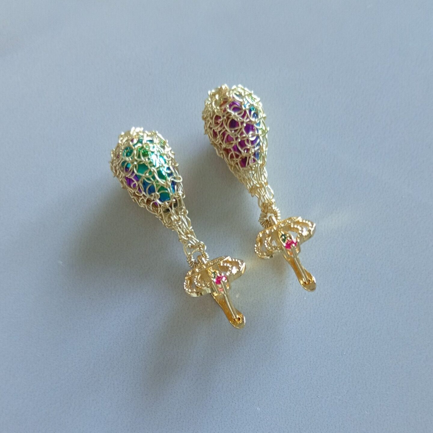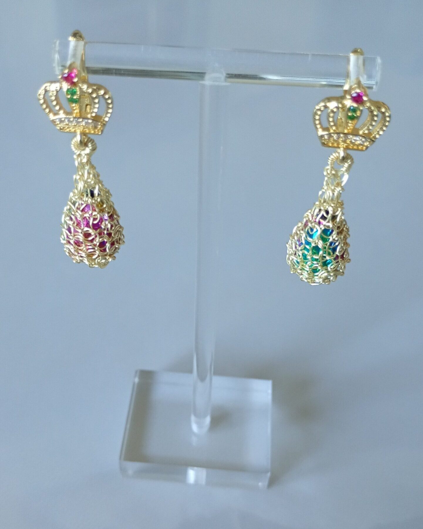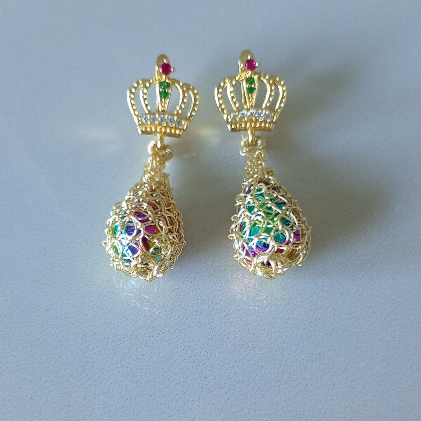 Orecchini in rame placcato in oro 14k corona con zirconie, ciondolo con pietra artificiale multicolore che oscilla linearmente con charm, realizzato da sapienti mani artigianali. Il gioiello va indossato con disinvoltura aggiungendo eleganza alla tua personalità . 10mm spessore, altezza 40mm, larghezza 10mm.
