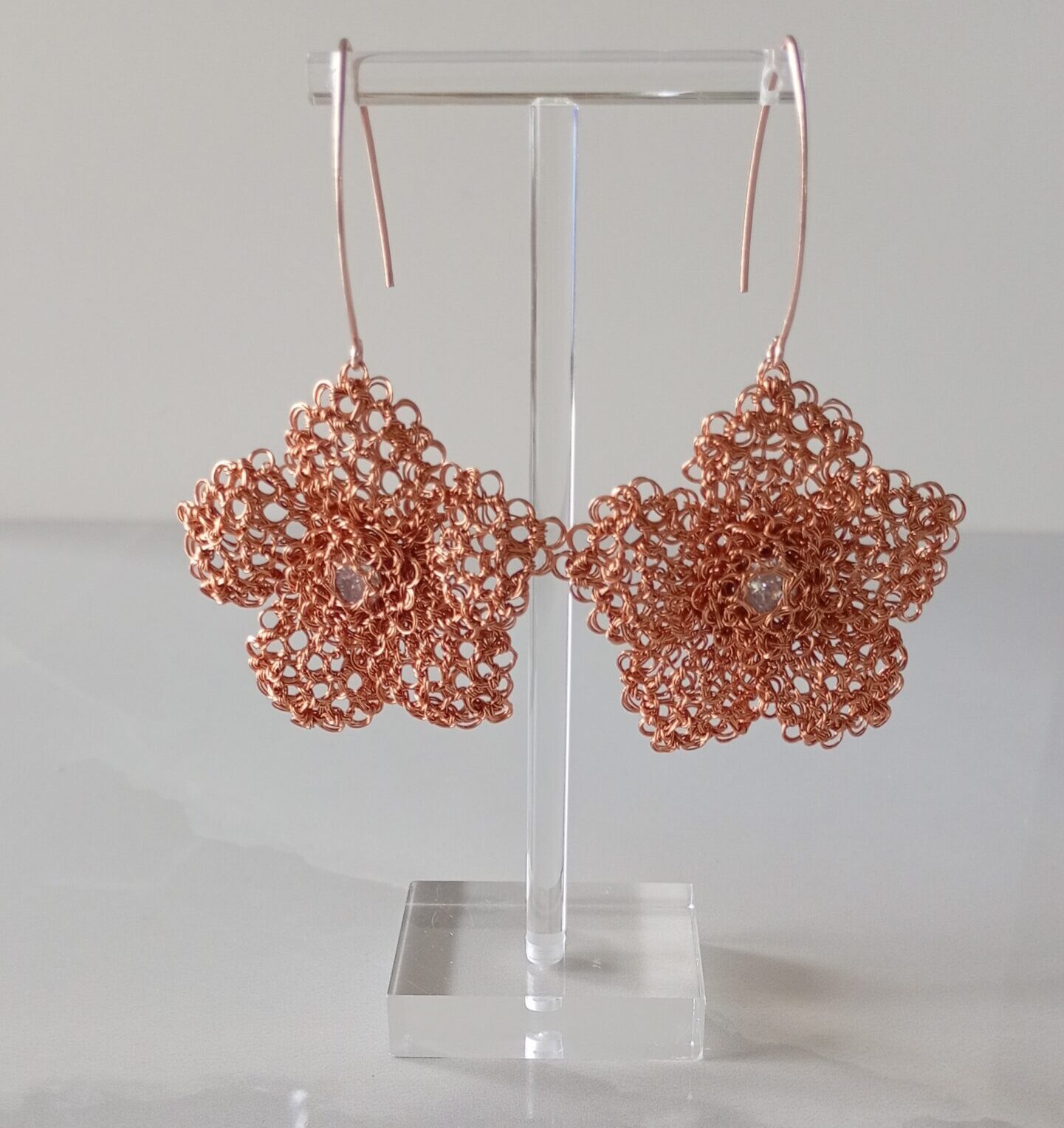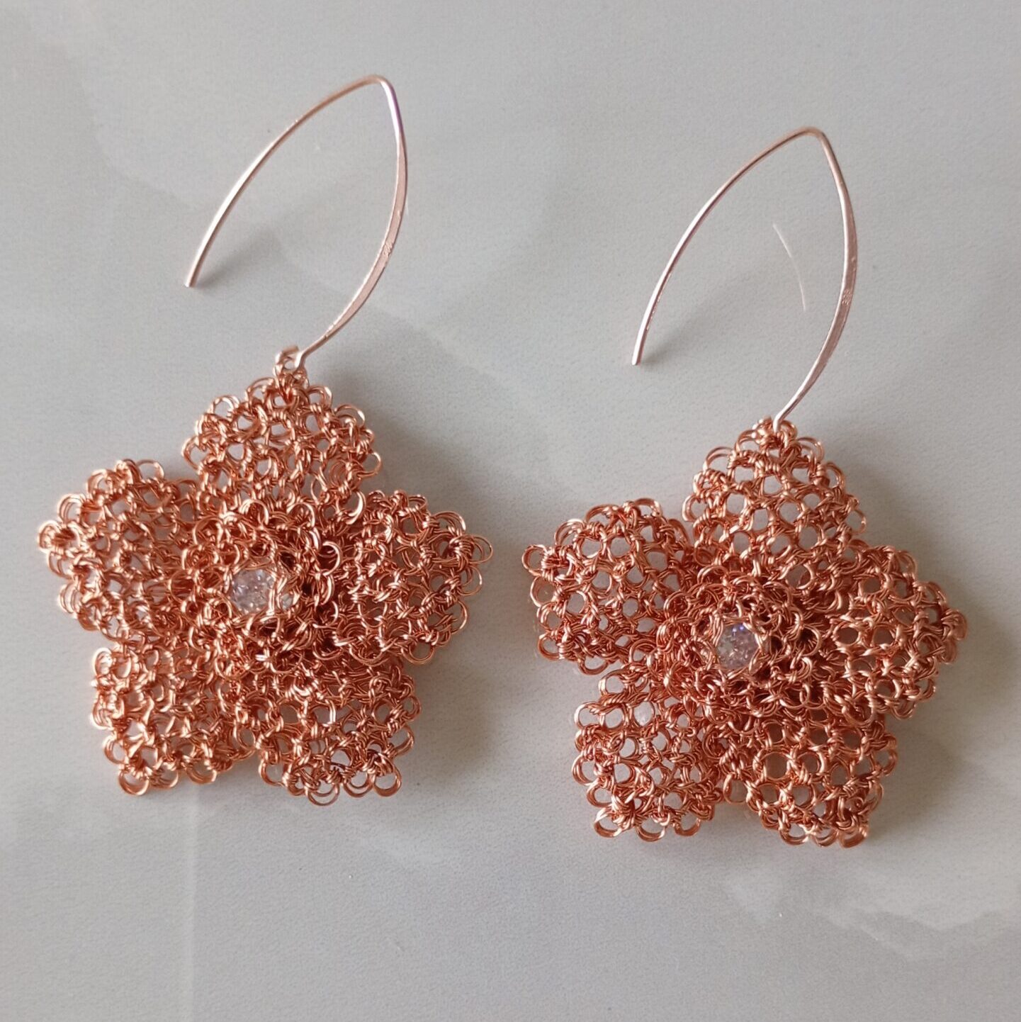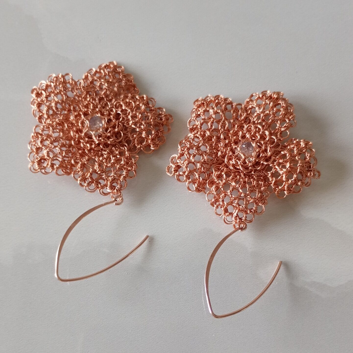 Orecchini pendenti in rame a forma di fiore stilizzata con al centro un punto luce di zirconia, chiusura a monachella in argento 925 placcato in oro rosa, realizzati da sapienti mani artigianali. Il gioiello è splendido va indossato con disinvoltura aggiungendo eleganza alla tua personalità. 20mm spessore, 70mm altezza, 45mm larghezza.