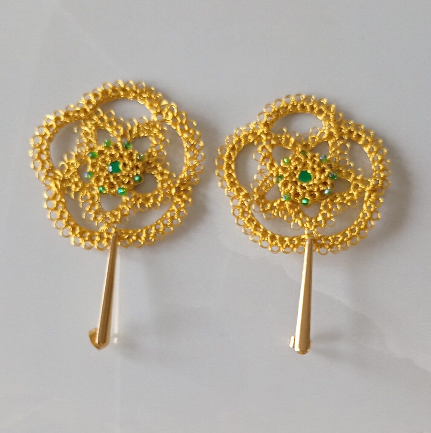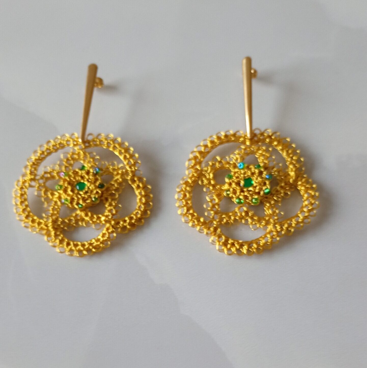 Orecchini pendenti in rame placcato in oro 14k con design circolare che includono cristalli verdi e due spilli dorati con chiusura a farfalla, realizzati da sapienti mani artigianali. Il gioiello è originale va indossato con eleganza aggiungendo raffinatezza alla tua personalità. 2mm profondità, 80mm altezza, larghezza 40mm.