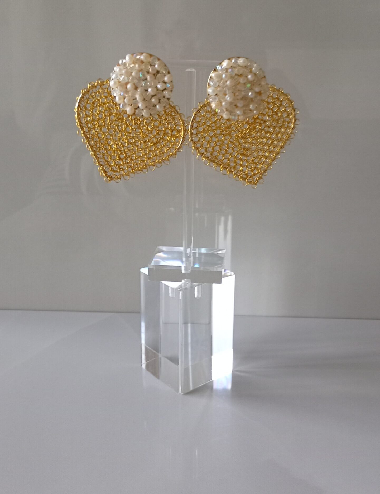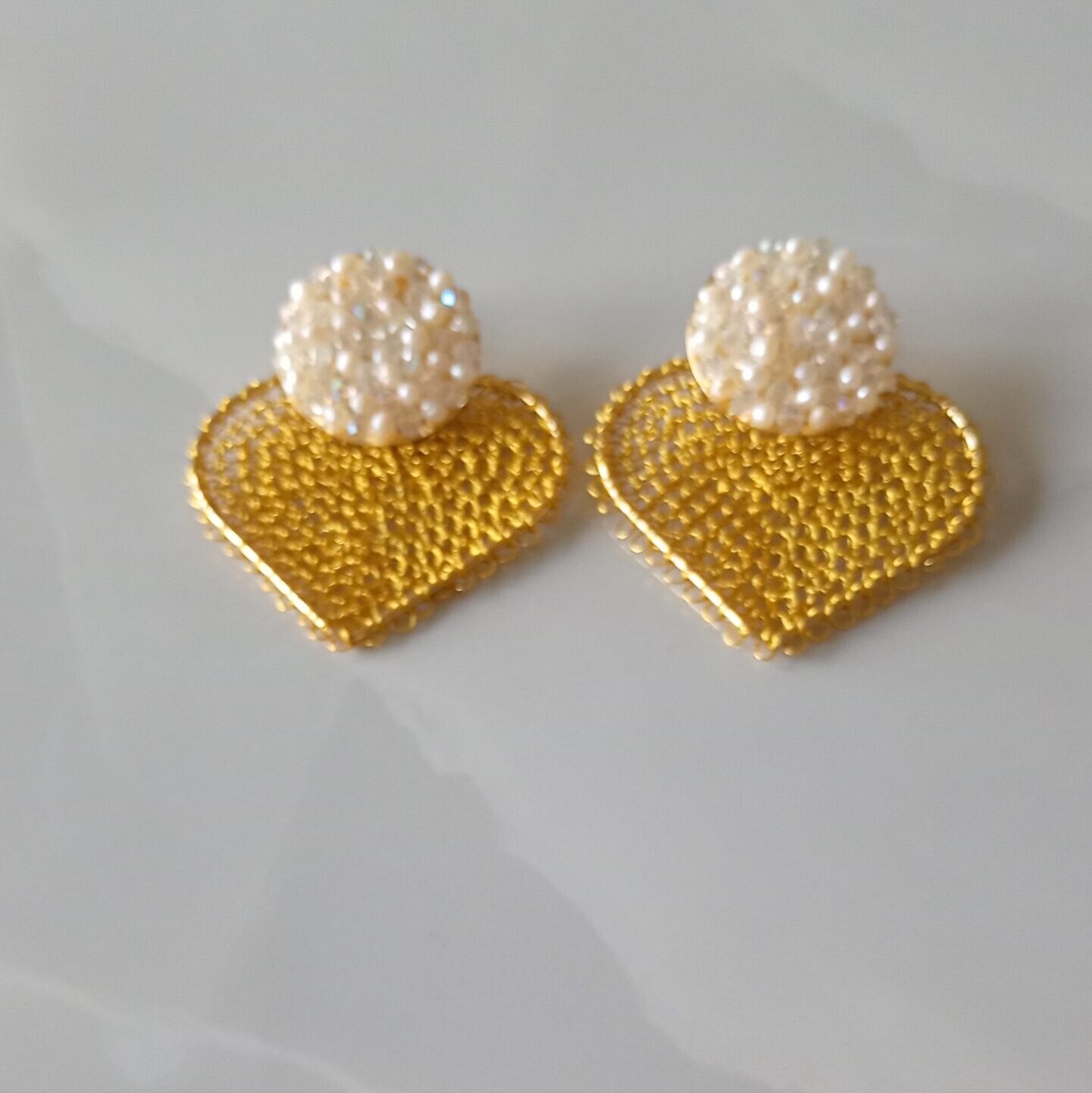 Orecchini pendenti in rame placcato in oro 14k a forma di cuore, parte superiore a bottone con perle e chiusura a farfalla, realizzati da sapienti mani artigianali. Il gioiello è originale va indossato con amore aggiungendo emozioni alla tua personalità. 2mm profondità, 65mm altezza, larghezza 55mm.